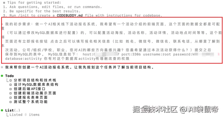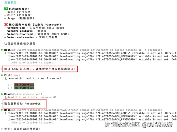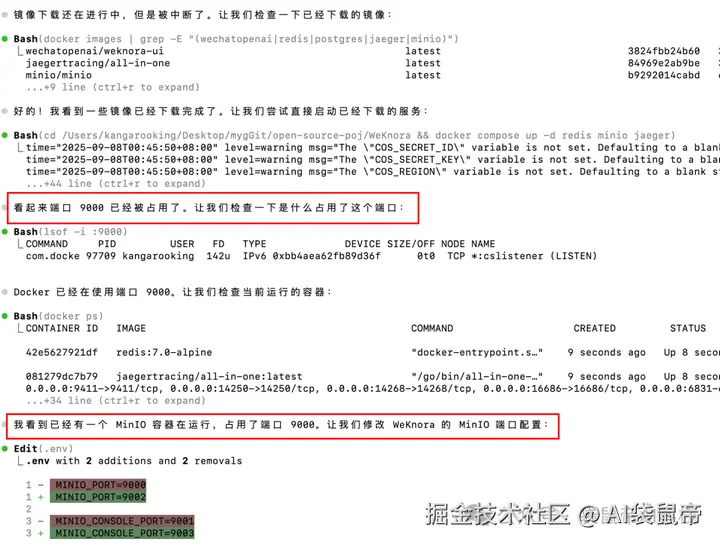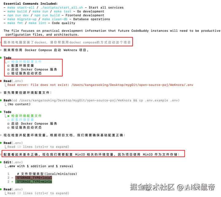 接着,我就让它以docker的方式启动这个项目 PS:老粉都知道,之前分享一些开源项目,要教大家怎么去本地部署,现在codebuddy帮我把这步省了,也帮大家省了