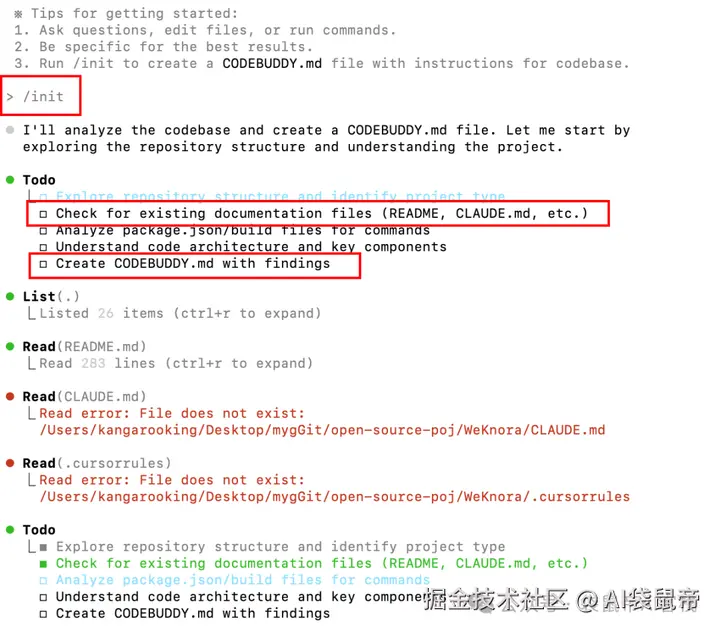 于是我就把这个开源项目下载下来,从项目根目录进入codebuddy 执行/init,先让codebuddy熟悉整个项目 最终生成一个CODEBUDDY.md的项目总结文件 PS:它还兼容了Claude Code,会先去找有没有Claude.md文件,如果没有才生成CODEBUDDY.md