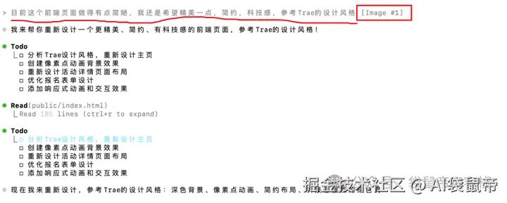 我个人还挺喜欢Trae的界面风格的。 于是我复制了一张Trae的首页图片,ctrl + v,粘贴到codebuddy窗口,让codebuddy参考改进一下UI