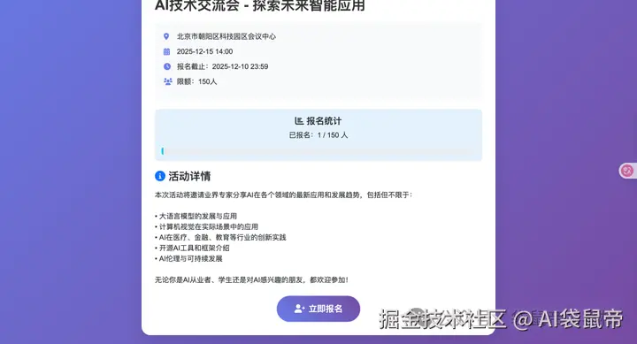 / 全栈应用轻松拿捏 最近想在昆明举办一个关于AI编程的线下活动 想通过Vibe Coding快速搞一个集宣发、报名为一体的小网站。 页面需要可配置,如果以后还有什么别的活动,修改一下配置信息就行,重复使用,非常灵活。 我把需求+数据库信息丢了过去