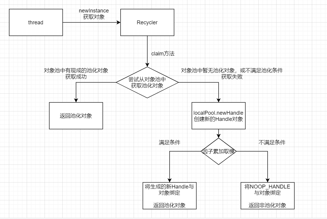 首先是从ByteBuf的对象池中获得一个ByteBuf对象,然后再为这个对象的底层数组分配相匹配的内存。本小节,我们主要探讨前一个操作。 - 获取ByteBuf对象逻辑是在PooledHeapByteBuf.newInstance方法中,通过一个全局的ObjectPool对象池来获得(RECYCLER.get())。