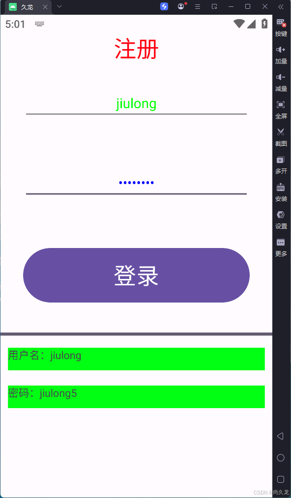 String name = nameEDT.getText().toString(); //获得用户名输入框对象中的文本转成字符串类型 放到 字符串类型的变量name中