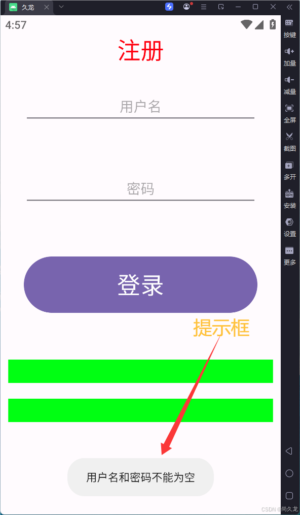整个界面的功能是:当没有用户名和密码输入时,点击了登录按钮,在屏幕下方就会有一个"用户名和密码不能为空的提示":