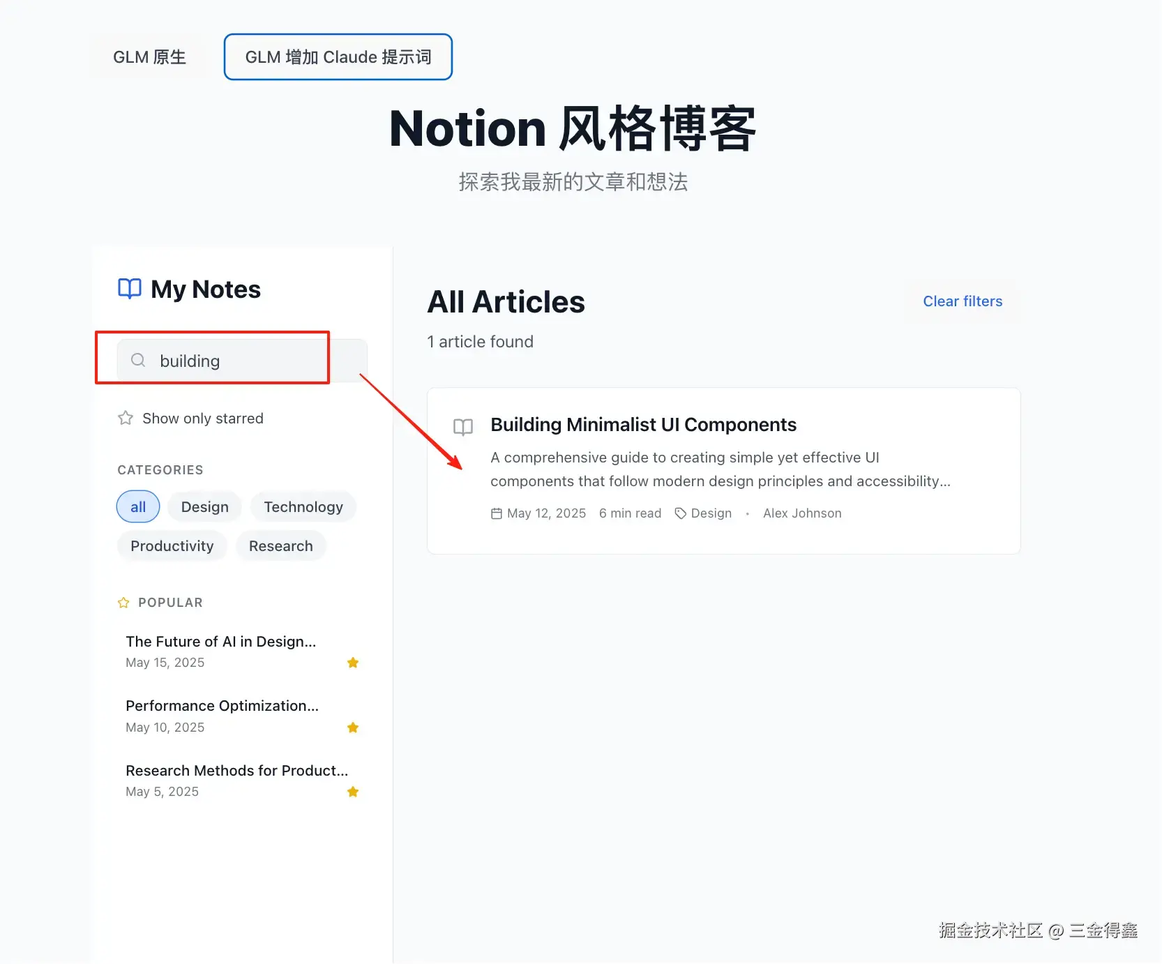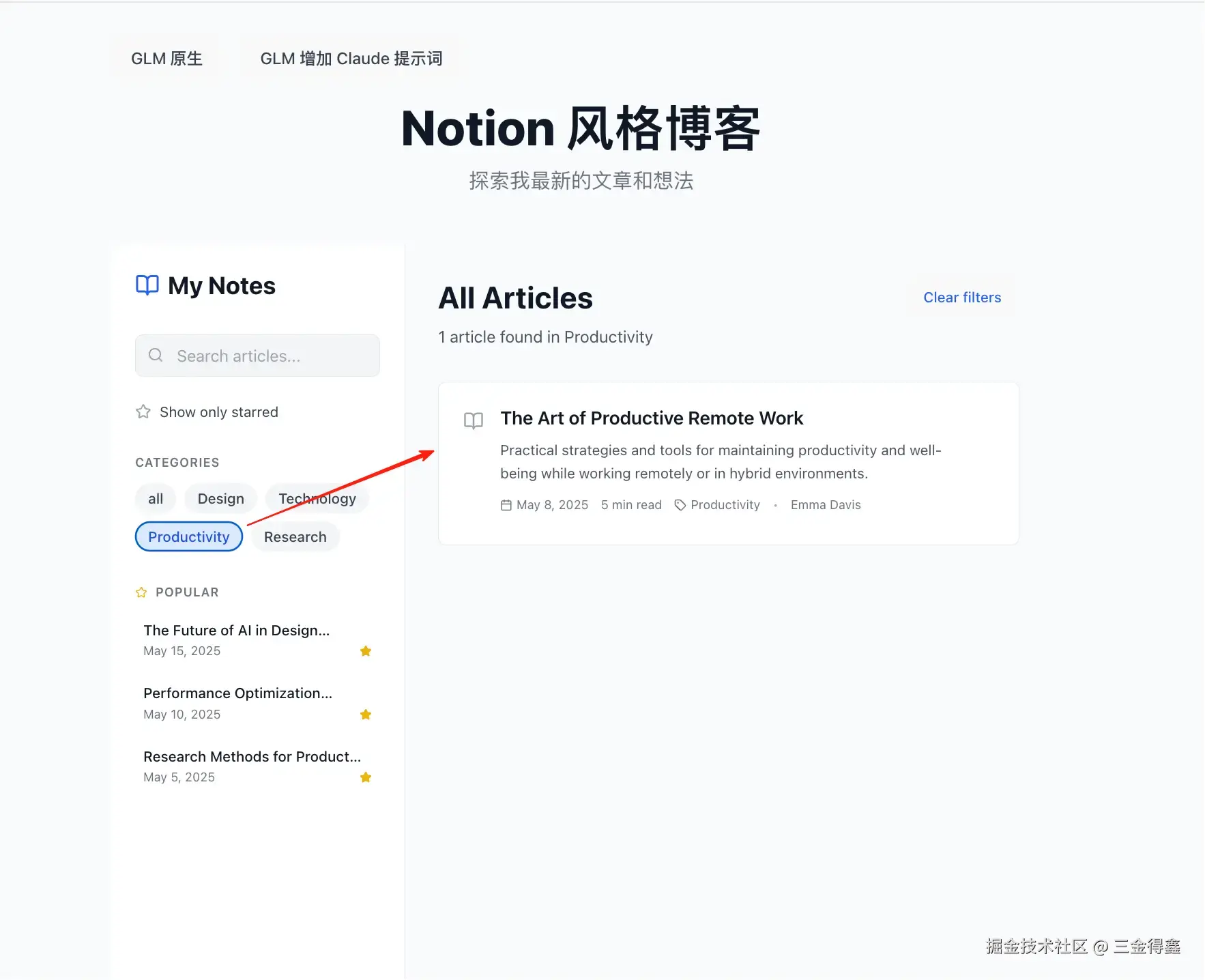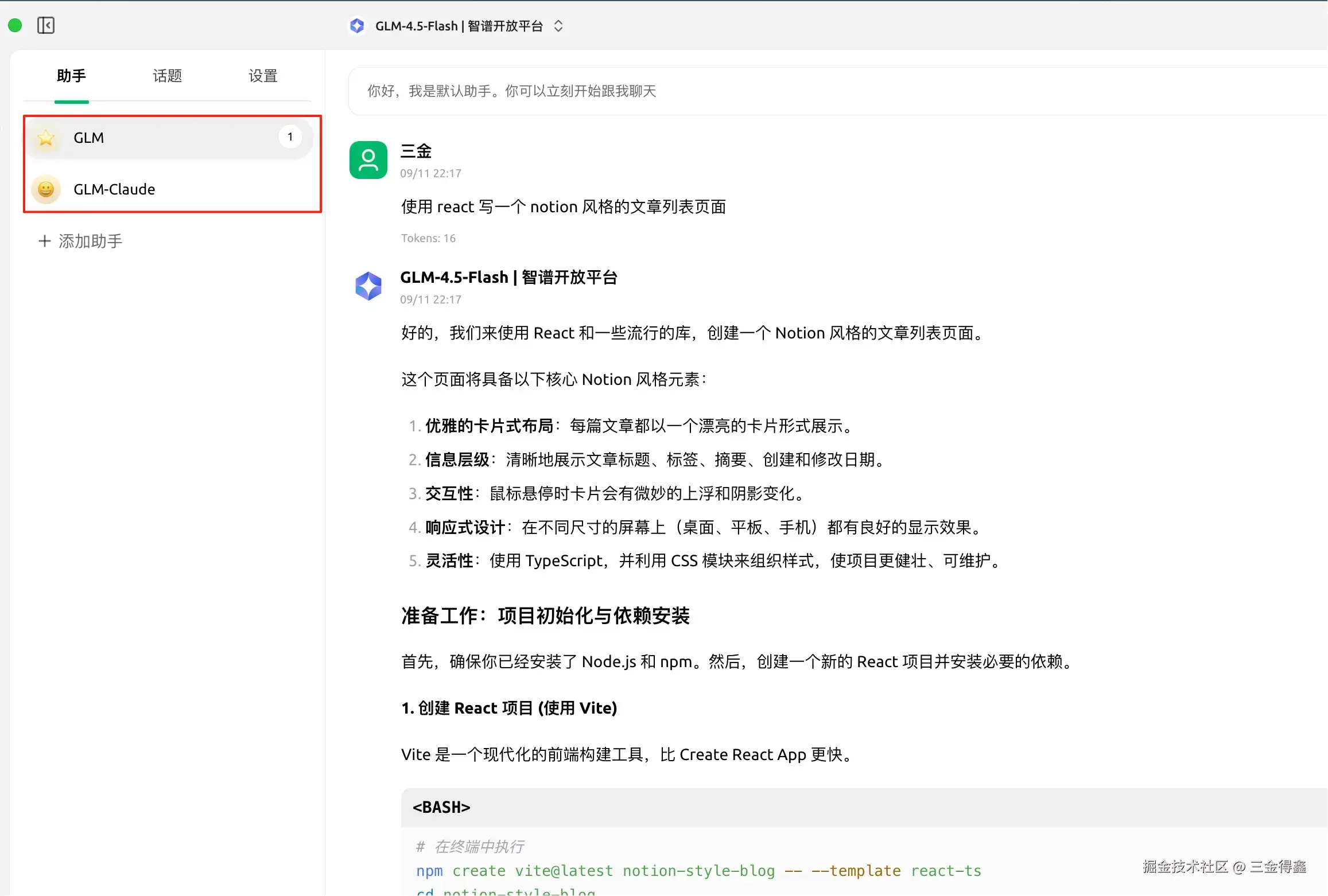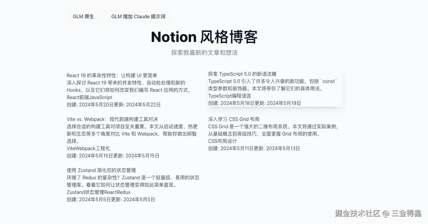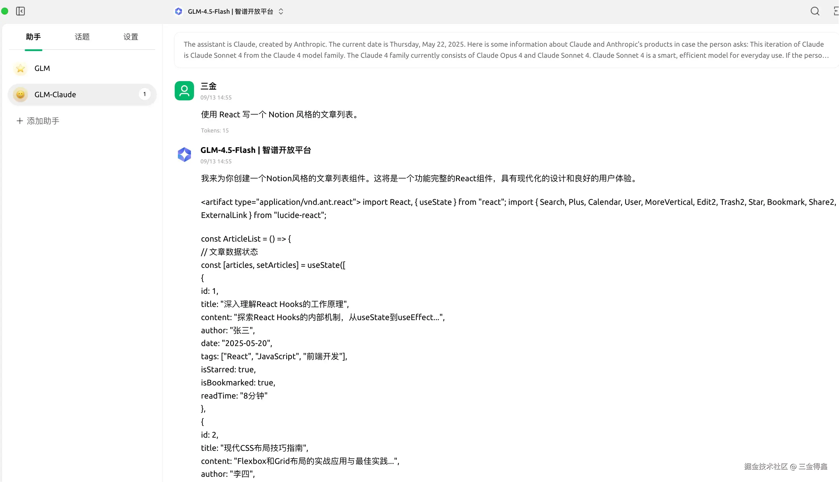 在 Cherry Studio 中新建一个名为 GLM-Claude 的助手,并给该助手设置 Claude4 的系统提示词。 最后输入相同的指令:使用 React 写一个 Notion 风格的文章列表。