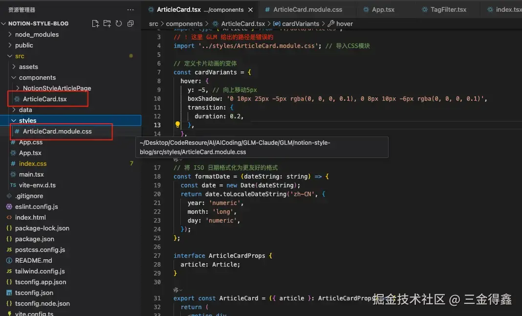 这次 GLM 并没有和上次一样,从项目创建开始引导,而是直接输出了一个 React 组件代码,并根据功能进行了模块拆分,其中还有用到 Tailwind CSS 进行了样式美化。
