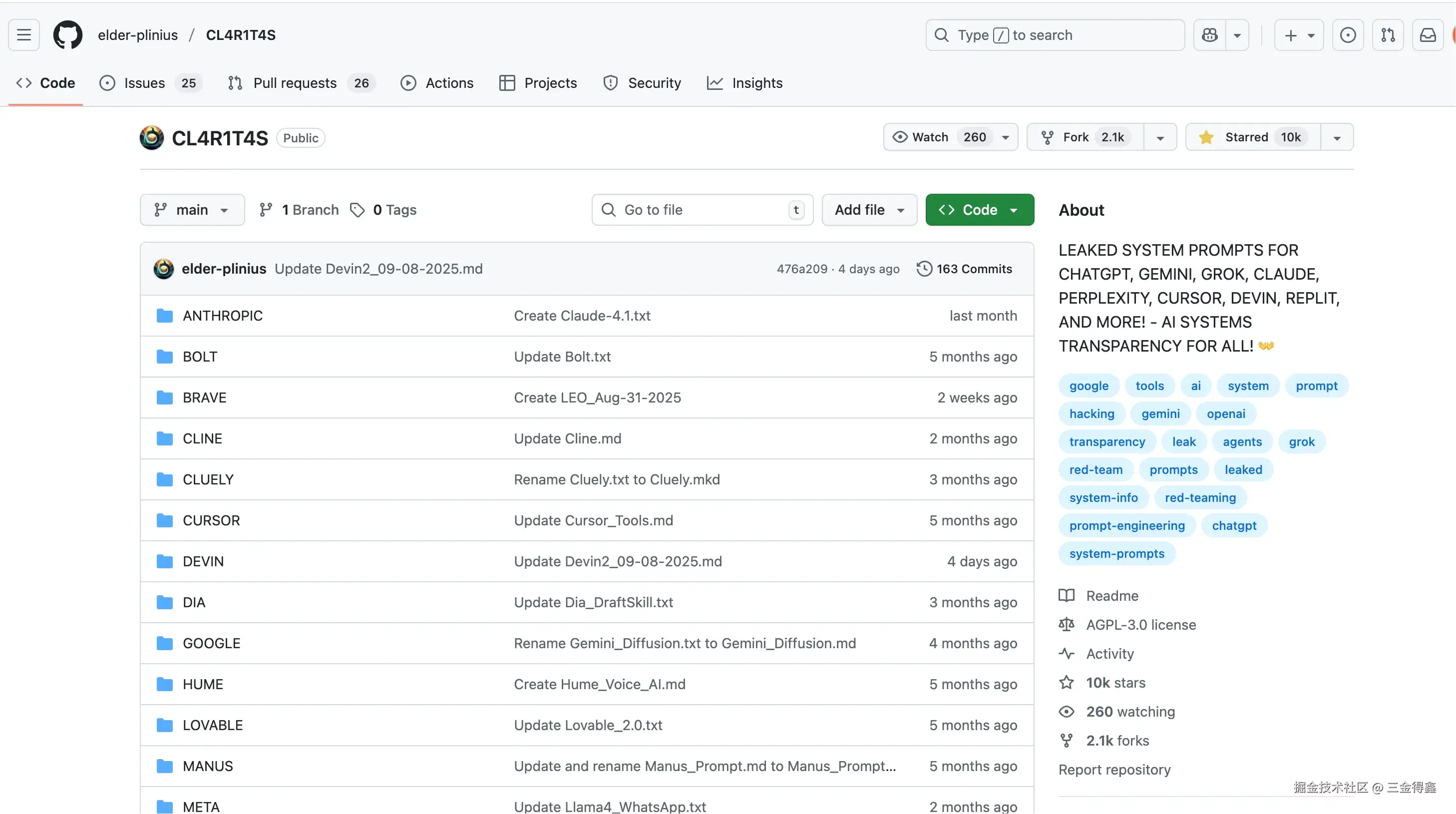 它收集了 ChatGPT、Gemini、Grok、Claude、Perplexity、Cursor、Devin、Replit 等 AI 应用的系统提示词,目前已经拥有 10k star,提示词数量高达 50 个!