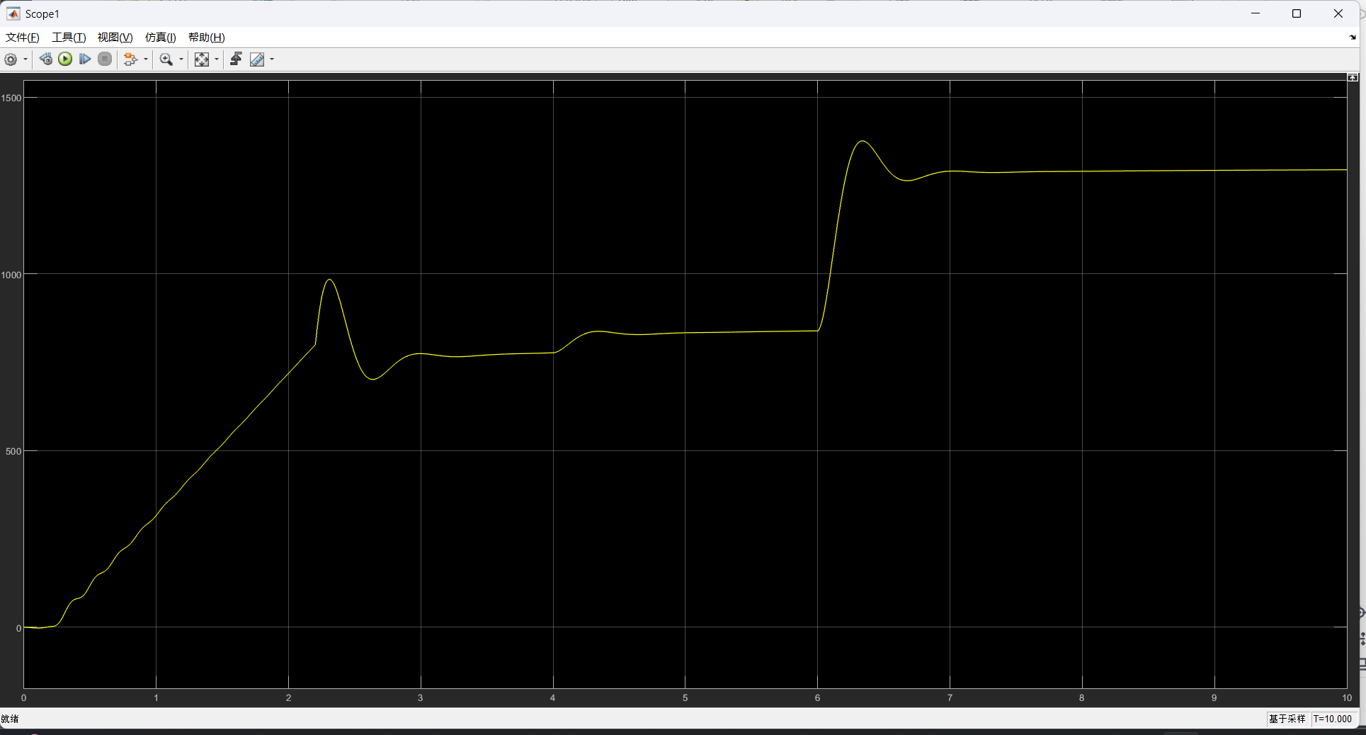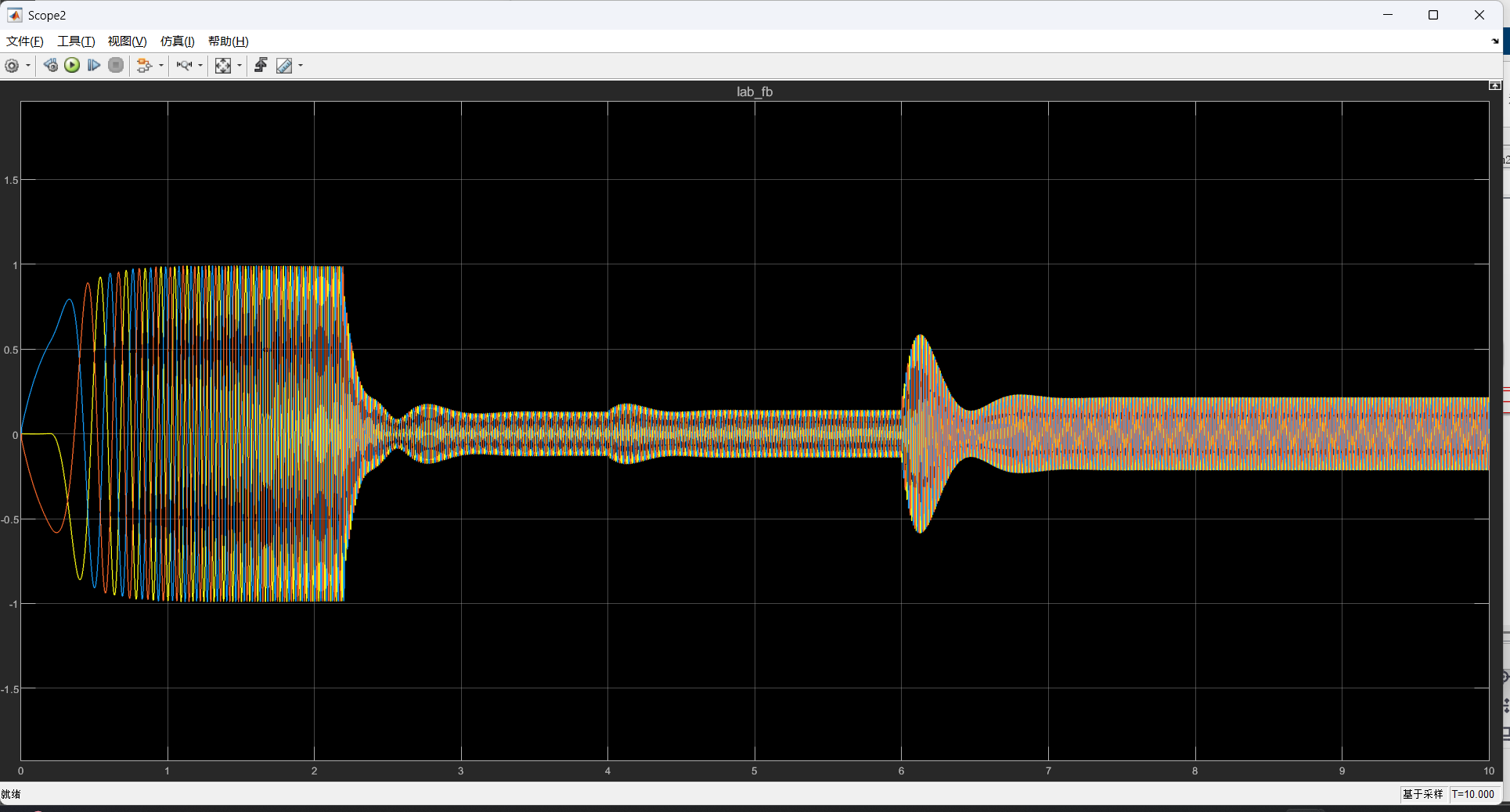 - 此时,FOC的控制算法模型已经搭建完成,点击方针按钮,查看三相电流波形和点输出速度;