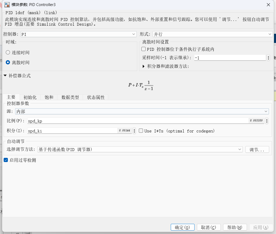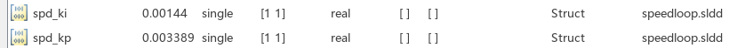 其中J是转动惯量,β是闭环带宽;通道电机的转动惯量都很难得到一个较为准确的值,有些电机出厂铭牌中也少有提到,根据经验值可以自己判断,此处设置为Kp:0.3389,Ki:0.0144;由于速度环的采样频率低于电流环,所以带宽一般都很小