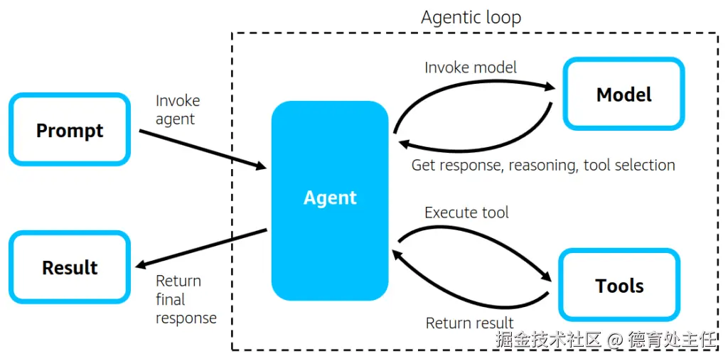 - 循环:这个过程会不断重复,直到 LLM 判断任务已经完成,并给出最终的答案。