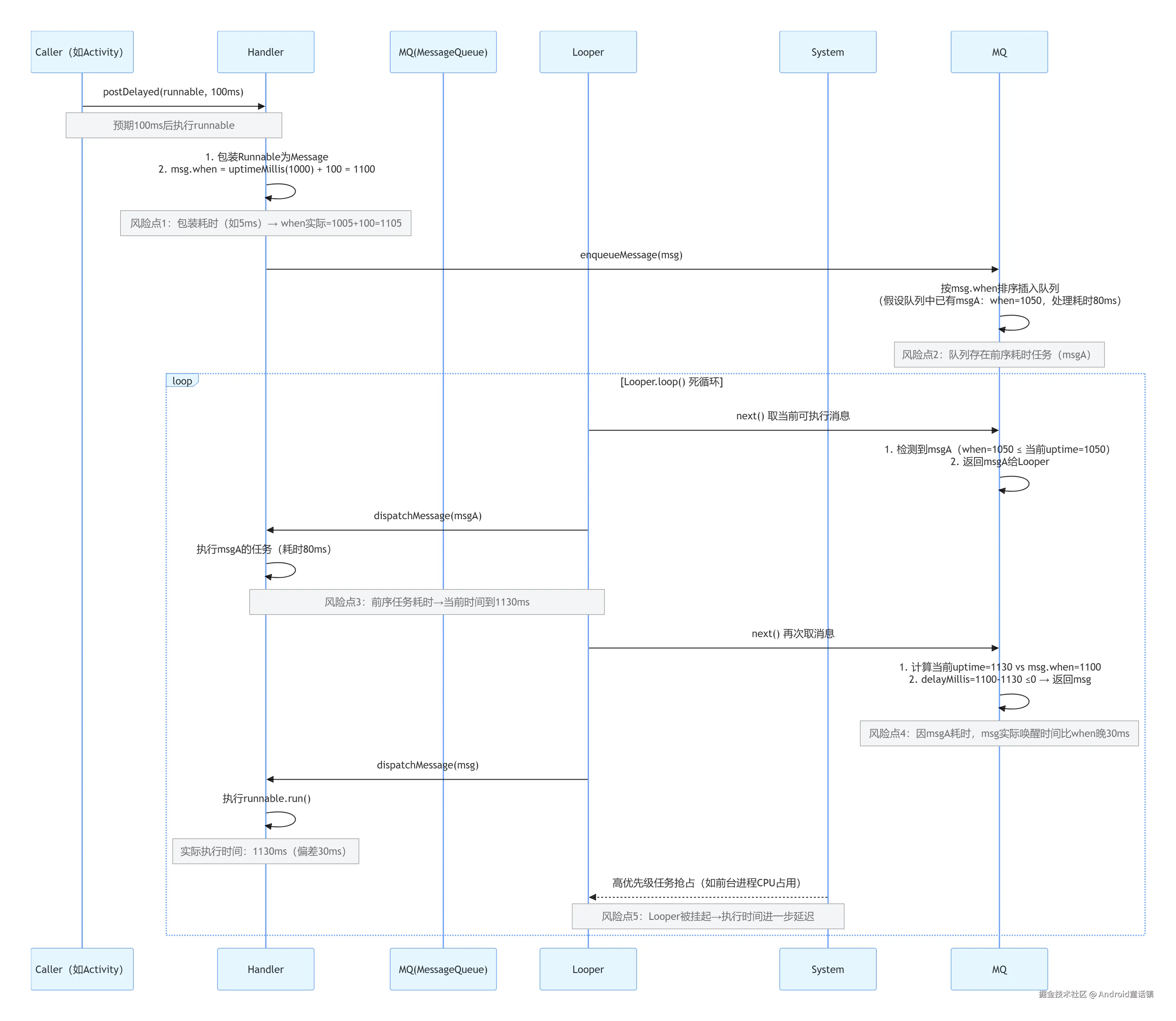 要理解 Handler.postDelayed 为何不适合精准定时任务 ,需先穿透其底层机制 ------ 它本质是基于「串行消息队列 + Looper 循环」的线程内任务调度,而非「系统级实时定时」。其精准性缺陷源于机制设计本身,而非实现细节,下面从 核心原因分析 和 时序图拆解 两方面展开。