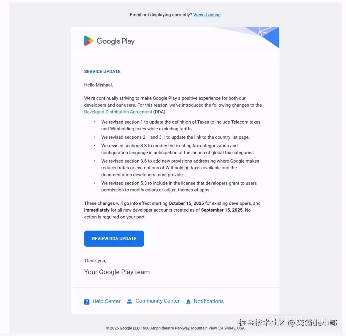 目前谷歌的公告还没有提及开发者是否可以选择退出此更改 ,但是谷歌已通过修改 Google Play 开发者分发协议 (DDA) 来通知用户,为了在 Google Play 上分发应用,开发者必须同意 DDA :