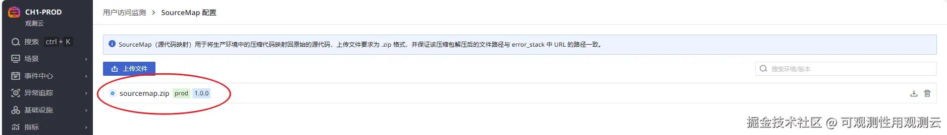 执行构建后可在观测云界面看到上传成功的 sourcemap.zip: