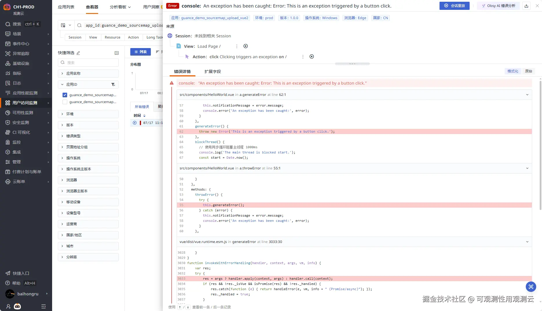 再次访问页面触发错误,稍等片刻查看捕获到的错误详情,即可看到映射后的原始代码,这与为应用添加场景时的代码一致: