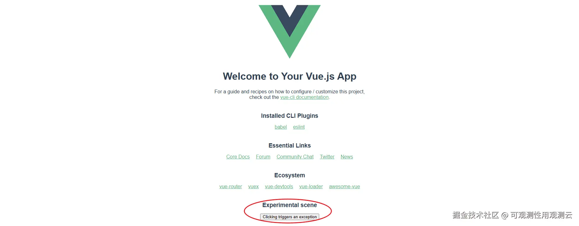 <li><button @click="throwError">Clicking triggers an exception</button></li>