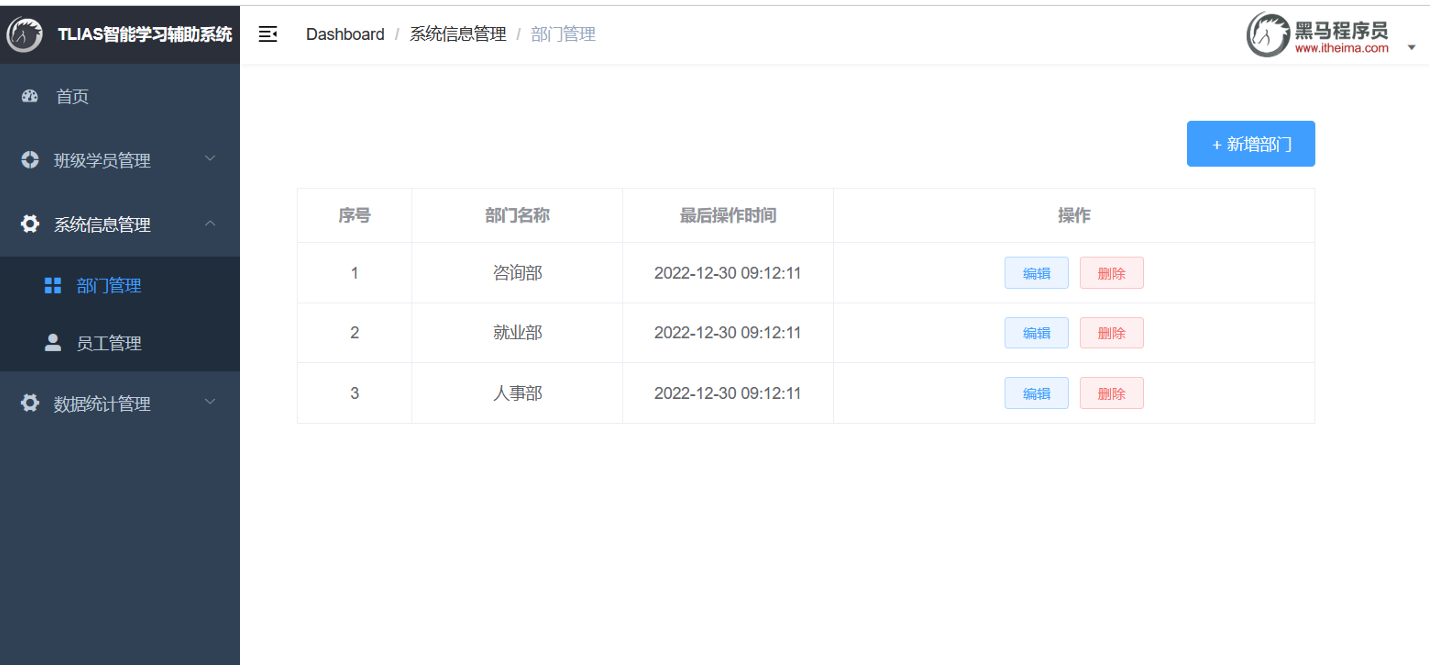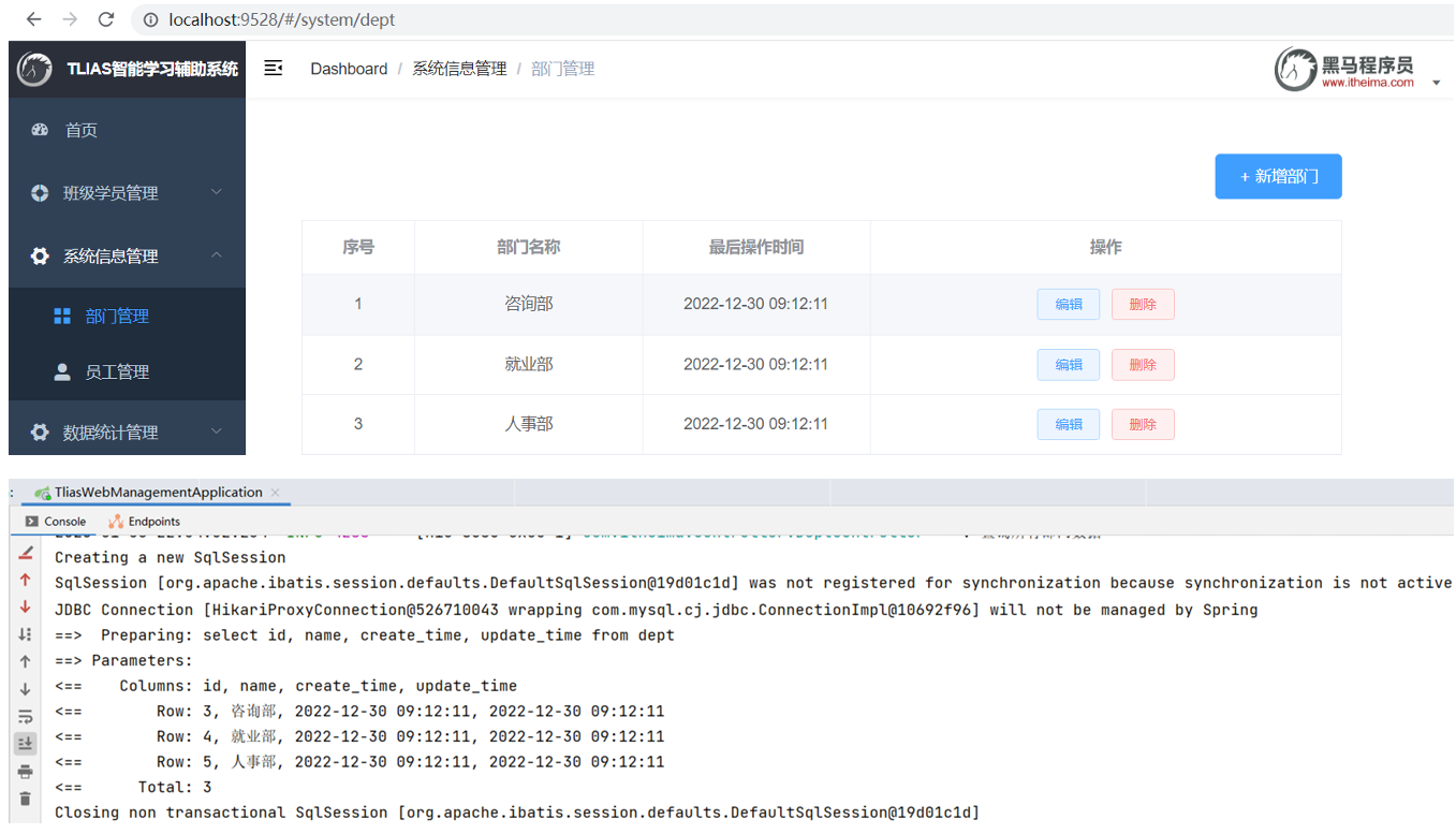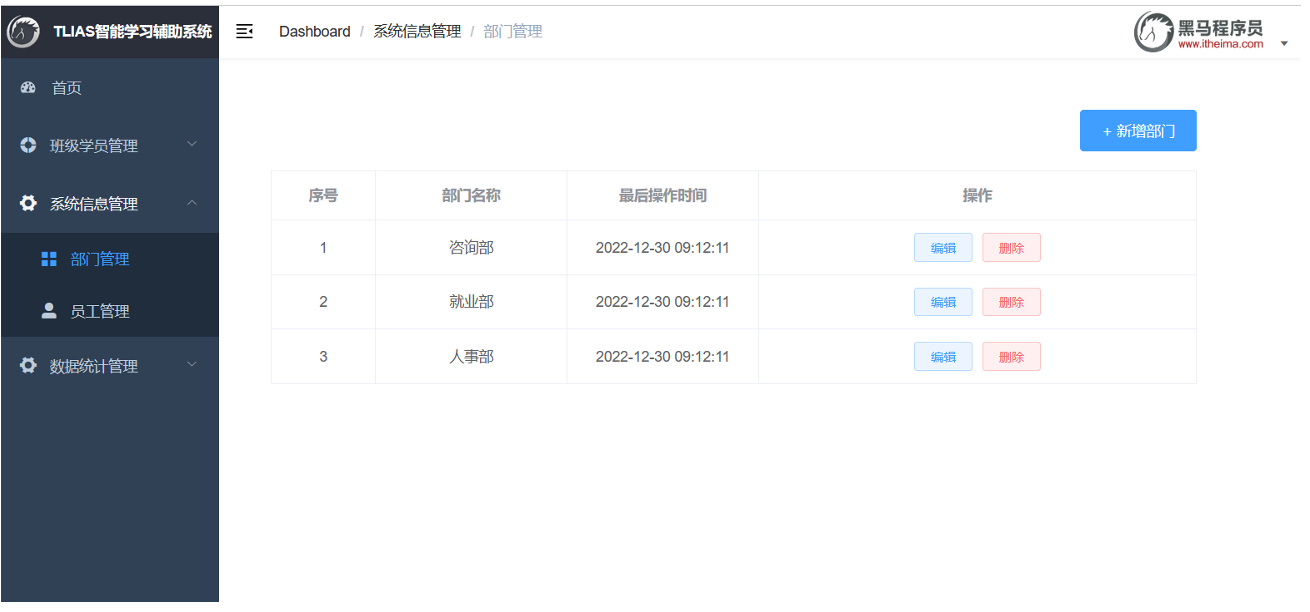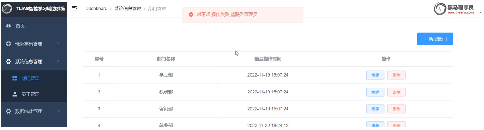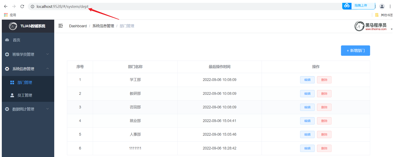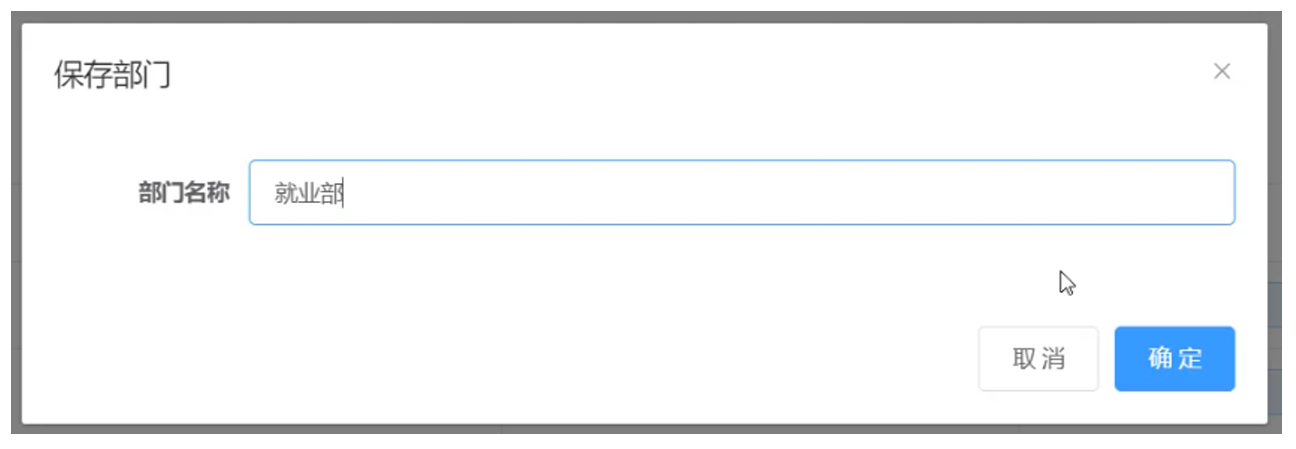 我们打开浏览器,访问系统中的新增部门操作,系统中已经有了 "就业部" 这个部门,我们再来增加一个就业部,看看会发生什么现象。