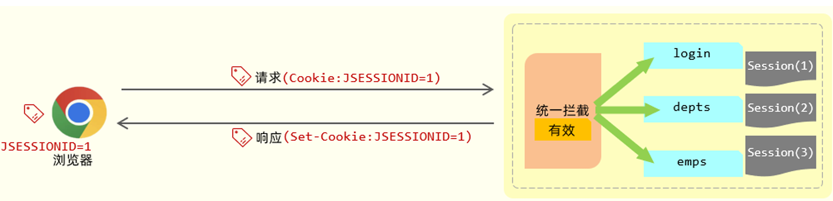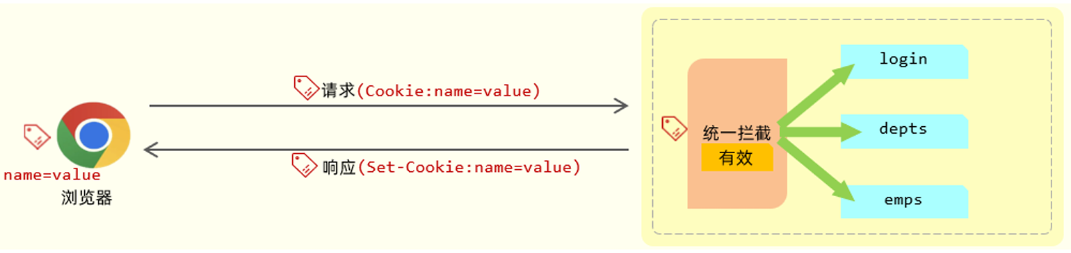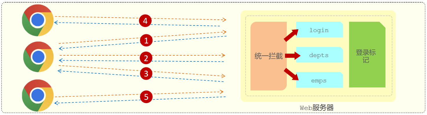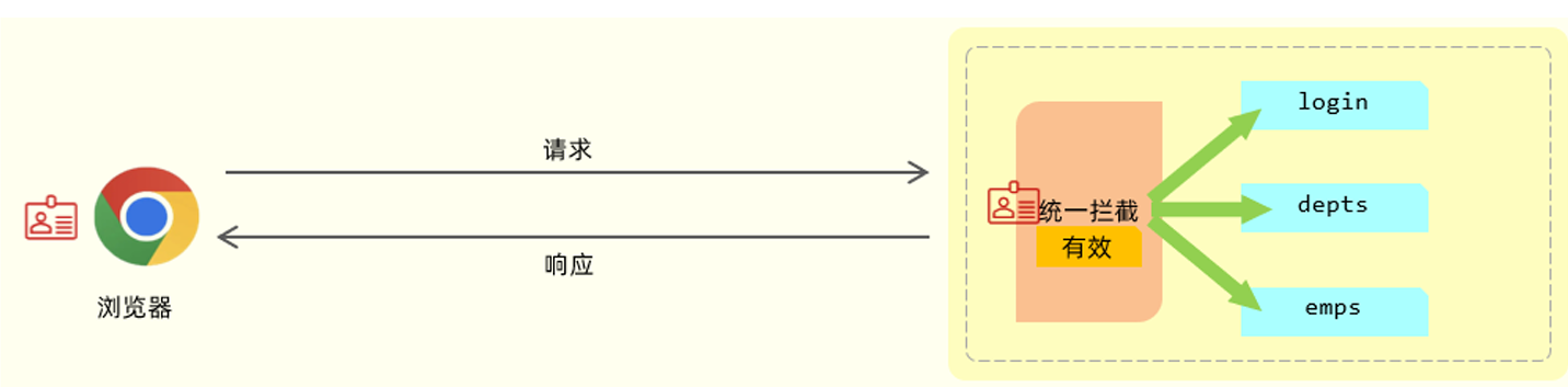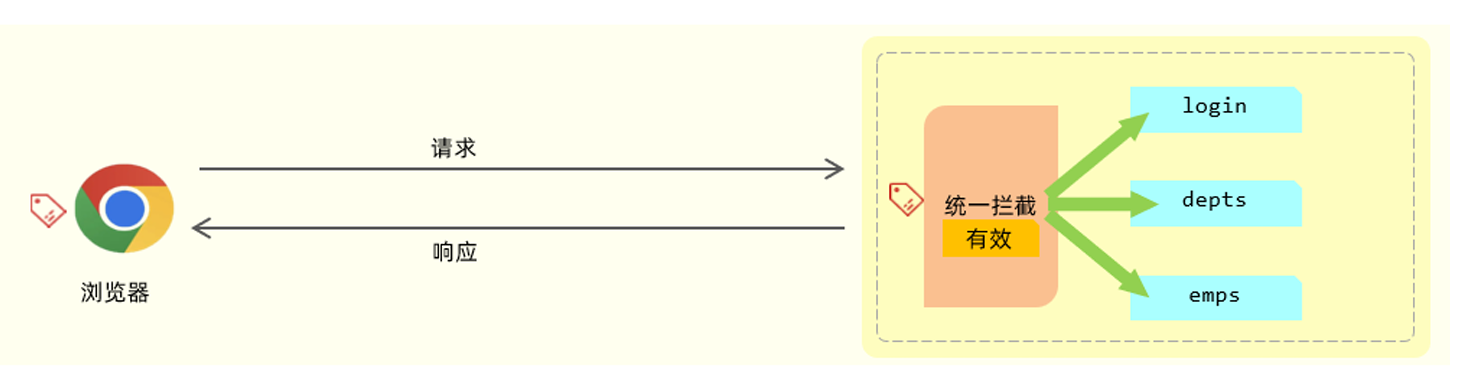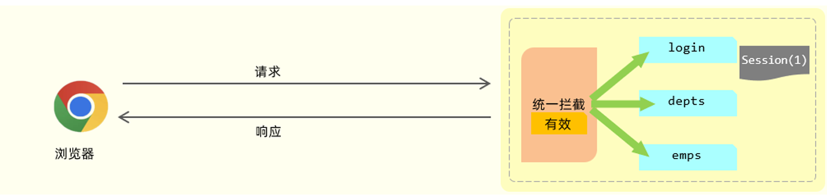 - 在浏览器发起请求时,需要在服务端进行统一拦截,拦截后进行登录校验。