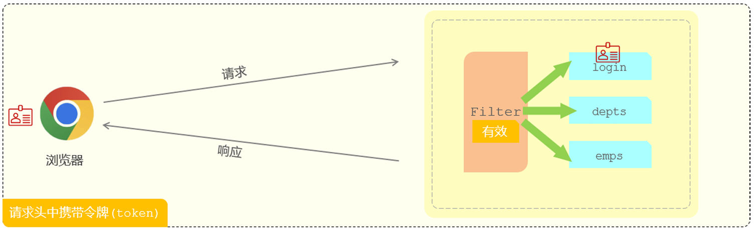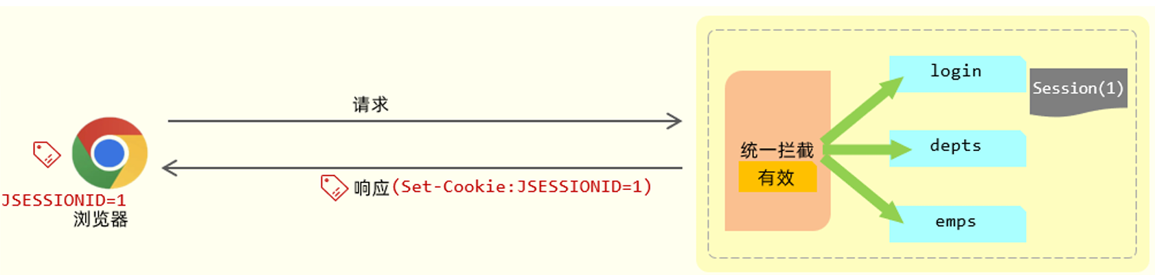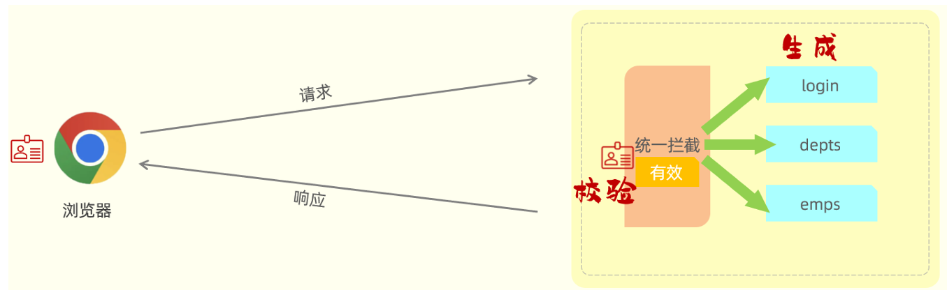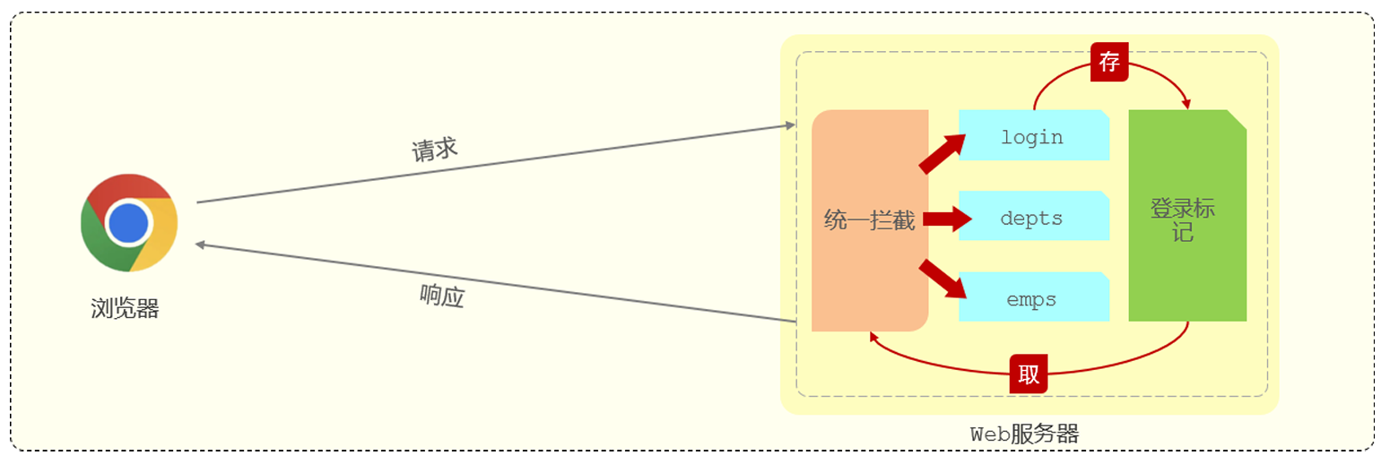 - 所谓登录校验,指的是我们在服务器端接收到浏览器发送过来的请求之后,首先我们要对请求进行校验。先要校验一下用户登录了没有,如果用户已经登录了,就直接执行对应的业务操作就可以了;如果用户没有登录,此时就不允许他执行相关的业务操作,直接给前端响应一个错误的结果,最终跳转到登录页面,要求他登录成功之后,再来访问对应的数据。