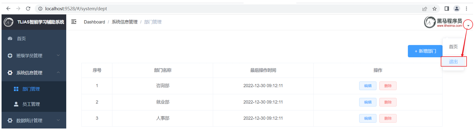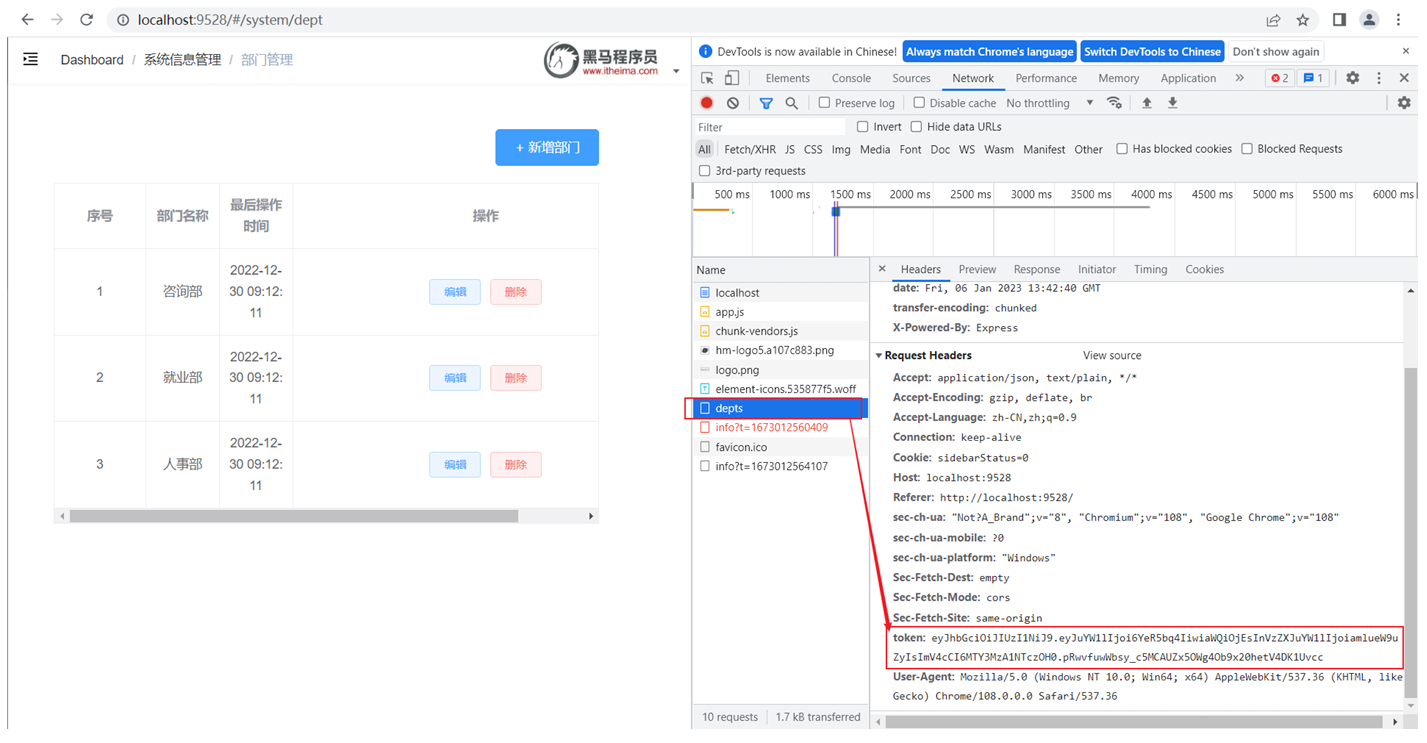但是当我们在浏览器中新的页面上输入地址:http://localhost:9528/#/system/dept ,发现没有登录仍然可以进入到后端管理系统页面。