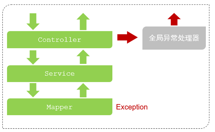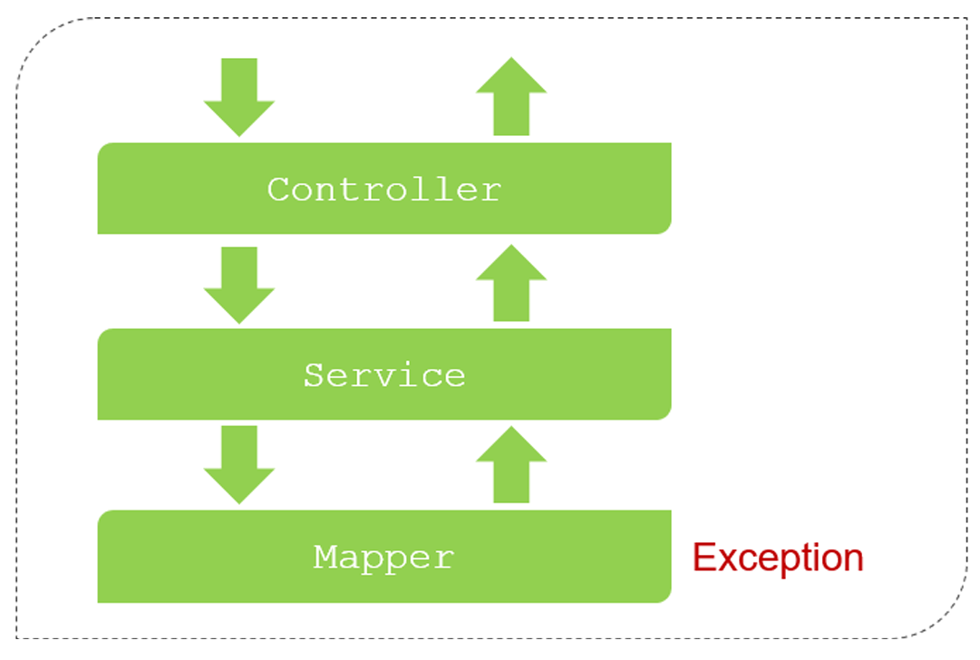 当我们没有做任何的异常处理时,我们三层架构处理异常的方案: - Mapper接口在操作数据库的时候出错了,此时异常会往上抛(谁调用Mapper就抛给谁),会抛给service。