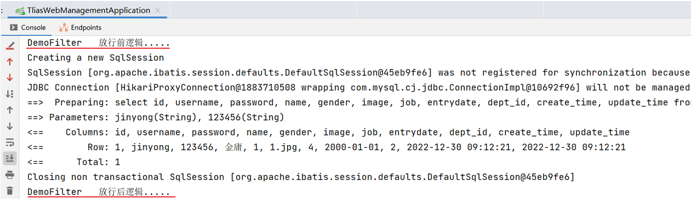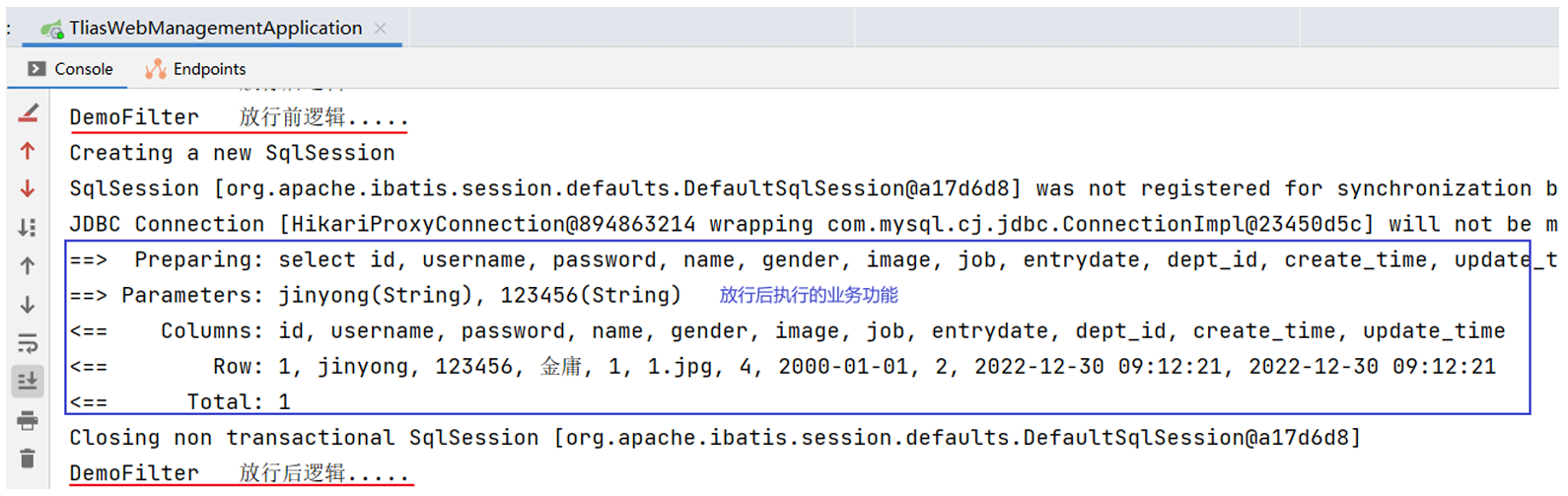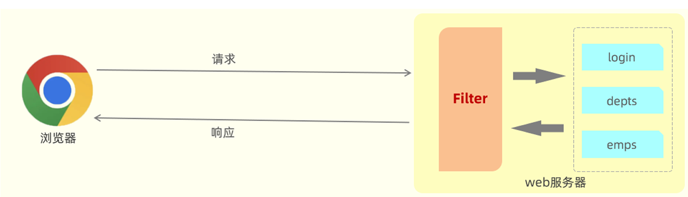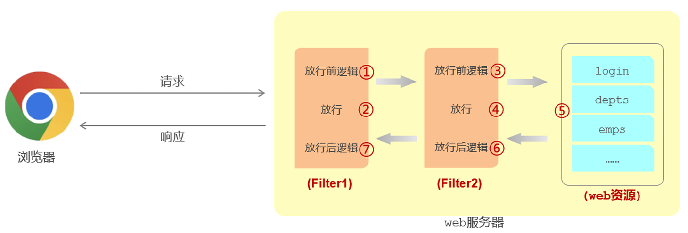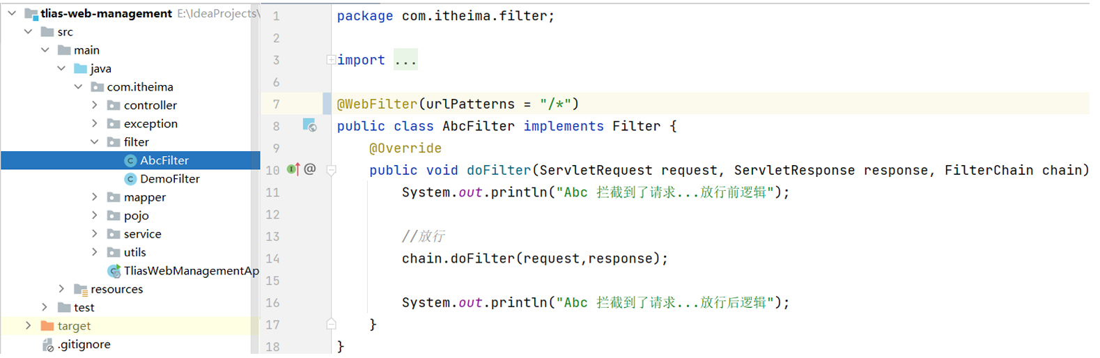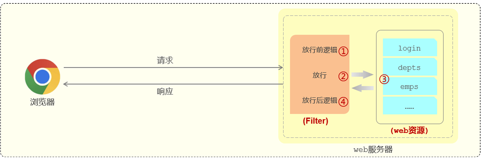- 当我们打开浏览器来访问部署在web服务器当中的web应用时,此时我们所定义的过滤器会拦截到这次请求。拦截到这次请求之后,它会先执行放行前的逻辑,然后再执行放行操作。而由于我们当前是基于springboot开发的,所以放行之后是进入到了spring的环境当中,也就是要来访问我们所定义的controller当中的接口方法。