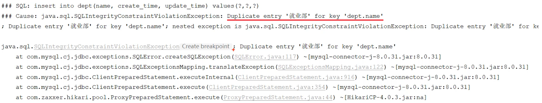 上述错误信息的含义是,dept部门表的name字段的值 就业部 重复了,因为在数据库表dept中已经有了就业部,我们之前设计这张表时,为name字段建议了唯一约束,所以该字段的值是不能重复的。