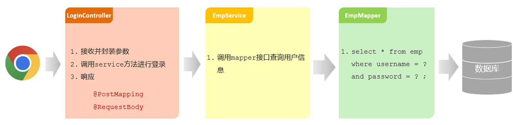 登录服务端的核心逻辑就是:接收前端请求传递的用户名和密码 ,然后再根据用户名和密码查询用户信息,如果用户信息存在,则说明用户输入的用户名和密码正确。如果查询到的用户不存在,则说明用户输入的用户名和密码错误。
