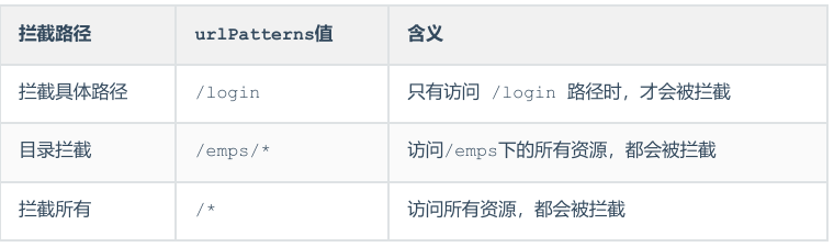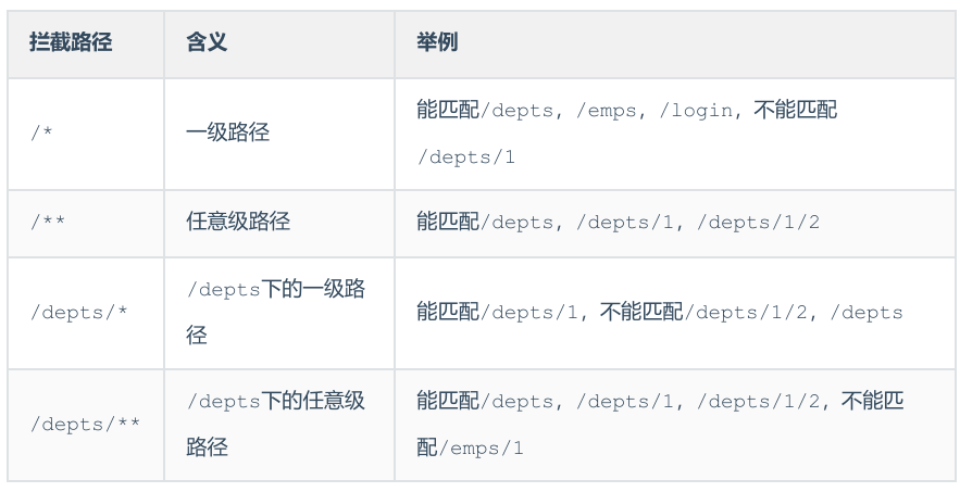 在拦截器中除了可以设置/拦截所有资源外,还有一些常见拦截路径设置:
