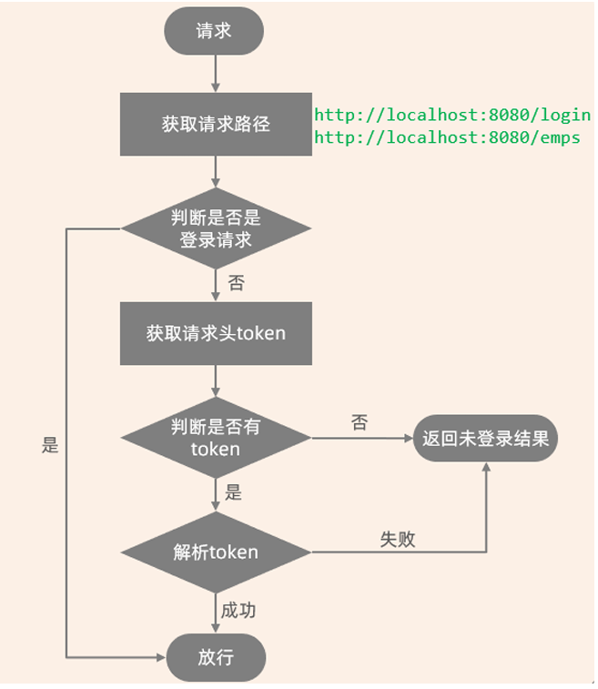 通过统一拦截的技术,我们可以来拦截浏览器发送过来的所有的请求,拦截到这个请求之后,就可以通过请求来获取之前所存入的登录标记,在获取到登录标记且标记为登录成功,就说明员工已经登录了。如果已经登录,我们就直接放行(意思就是可以访问正常的业务接口了)。