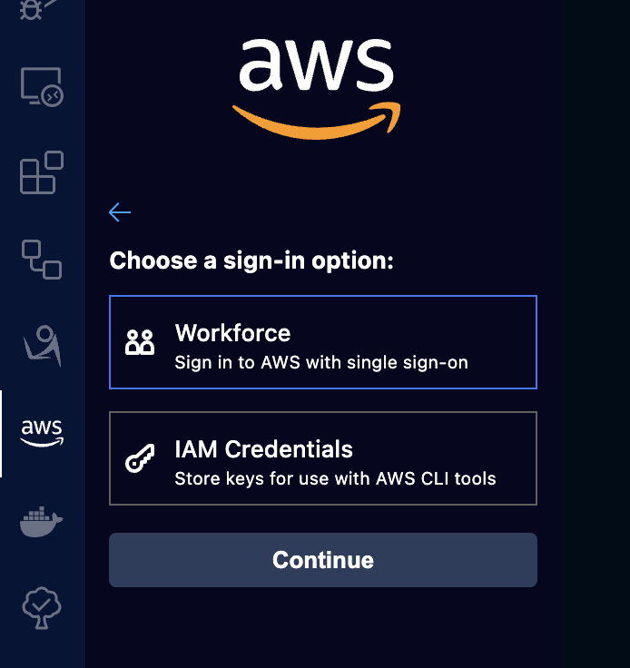 在 VS Code 安装 AWS Toolkit 后,在左侧工具栏点击 AWS 图表,要求登陆