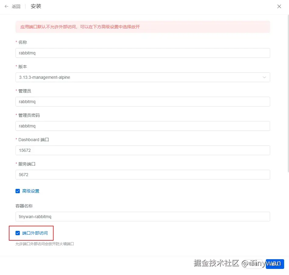 注:这里需要勾选【端口外部访问】,方便本地调试