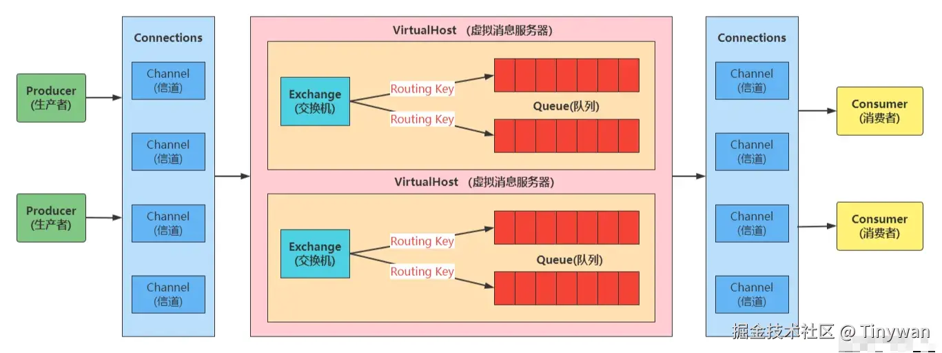 - Message Broker:(消息代理服务器)是一个虚拟的概念,而RabbitMQ是Message Broker的一个实例。