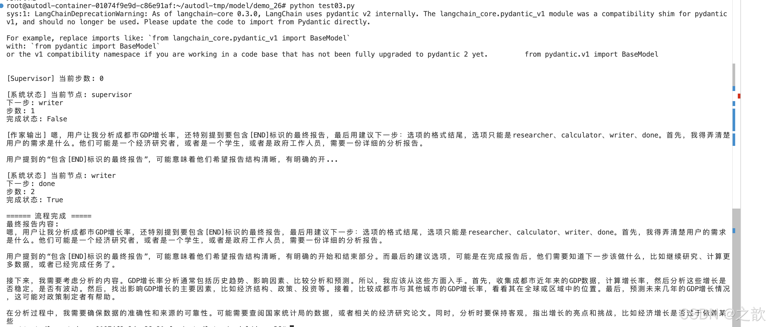 Supervisor\] 当前步数: 0 \[Supervisor决策\] 原始输出: 嗯,我现在需要完成一个关于成都市gdp增长率分析的任务。首先,我得理解什么是gdp增长率。gdp是gross domestic product的缩写,代表一个地区在一定时期内生产的最终产品和服务的总值。增长率则是gdp在一段时间内的增长百分比,通常用来衡量经济的增长情况。 接下来,我需要收集成都市近年来的gdp数据。这可能包括过去几年的gdp数值,以及对应的年份。然后,我需要计算这些数据的增长率。计算方法通常是用当前年份的gdp减去前一年的gdp,然后除以前一年的gdp,最后乘以100%得到增长率。例如,如果2020年的g \[系统状态\] 当前节点: supervisor \[状态\] next_agent: done \[状态\] step_count: 1 root@autodl-container-01074f9e9d-c86e91af:\~/autodl-tmp/model/demo_26# python test04.py sys:1: LangChainDeprecationWarning: As of langchain-core 0.3.0, LangChain uses pydantic v2 internally. The langchain_core.pydantic_v1 module was a compatibility shim for pydantic v1, and should no longer be used. Please update the code to import from Pydantic directly. For example, replace imports like: `from langchain_core.pydantic_v1 import BaseModel` with: `from pydantic import BaseModel` or the v1 compatibility namespace if you are working in a code base that has not been fully upgraded to pydantic 2 yet. from pydantic.v1 import BaseModel \[Supervisor\] 当前步数: 0 \[Supervisor决策\] 原始输出: 好的,我现在需要分析用户的问题:"成都市gdp增长率分析"。首先,我要理解这个问题的主要目标是什么。gdp增长率分析通常涉及到收集和分析过去几年的gdp数据,计算增长率,然后进行趋势分析和预测。这可能包括收集经济数据、进行统计计算、建立模型、撰写报告以及最终的结论和建议。 接下来,我需要将这些步骤与用户提供的选项对应起来。用户提供的选项有四个:researcher、calculator、writer、done。我的任务是将每个步骤匹配到正确的选项。 首先,收集和分析gdp数据属于研究阶段,因此对应的是"researcher"。然后,计算增长率需要数学计算,所以是"calculator"。撰写最终报告则是"writer"的 \[系统状态\] 当前节点: supervisor \[状态\] next_agent: writer \[状态\] step_count: 1 \[作家输出\] 好的,我现在需要分析成都市GDP增长率,并撰写一份报告。首先,我应该了解成都市的经济情况,包括GDP的基本数据和趋势。接下来,我需要收集相关的经济指标,比如GDP增长率、GDP组成部分、投资数据和就业情况。然后,分析这些数据,找出经济增长的关键驱动因素,比如产业升级、科技创新或基础设施建设。同时,也要关注潜在的风险,如经济结构的单一性或外部环境的影响。最后,根据分析结果,提出可行的建议,比如优化产业结构、加大科技创新投入或促进消费市场发展。完成后,记得添加\[END\]标识。 ```plaintext 建议下一步:researcher ``` \[系统状态\] 当前节点: writer \[状态\] next_agent: researcher \[状态\] step_count: 2 \[Supervisor\] 当前步数: 2 \[Supervisor决策\] 原始输出: 好的,我现在需要分析用户提供的查询,并生成一个适当的回复。首先,用户给出的查询是:"成都市gdp增长率分析"。然后,用户提供了三个选项,分别是"researcher"、"calculator"、"writer"和"done",并要求选择一个单词作为回复。 接下来,我要理解每个选项的含义和适用场景。第一个选项"researcher"指的是研究人员,通常用于需要深入研究和分析的情况。第二个选项"calculator"则是指进行数学计算的工具或过程,适用于需要数值计算的情况。第三个选项"writer"则是指生成报告或文档,适用于需要撰写或整理结果的情况。最后一个选项"done"则是表示流程已经完成,可以结束。 现在,分析用户的需求。用户提到 \[系统状态\] 当前节点: supervisor \[状态\] next_agent: writer \[状态\] step_count: 3 \[作家输出\] 嗯,用户让我分析成都市GDP增长率,并且给出了一个示例回复。看起来用户可能需要一份详细的分析报告,或者至少是了解成都经济发展的趋势。首先,我需要明确用户的需求是什么。他们可能是一位研究人员,或者是需要经济数据支持的决策者,也可能是学生或分析师。 用户提供的示例回复中,我建议下一步是"researcher",这可能意味着他们希望我继续深入分析,或者可能需要更多的数据或方法。所以,我需要考虑用户可能需要哪些具体的信息或步骤。 接下来,我应该考虑分析GDP增长的几个关键因素,比如经济结构、投资领域、就业情况、科技创新、区域协同发展、政策支持、国际影响力、人口结构变化以及未来 \[系统状态\] 当前节点: writer \[状态\] next_agent: done \[状态\] step_count: 4 \[Supervisor\] 当前步数: 4 \[Supervisor决策\] 原始输出: 好,我现在需要帮助用户分析成都市gdp增长率,并给出下一步的建议。用户之前已经给出了一个示例回复,其中建议下一步是"researcher",这可能意味着他们希望进一步深入研究或需要更多的数据支持。 首先,我应该回顾一下用户的需求。他们可能是一位研究人员,或者是需要经济数据支持的决策者,也可能是学生或分析师。他们需要了解成都市的经济表现,特别是gdp增长的情况,可能还涉及到未来的趋势预测。 接下来,我需要考虑分析gdp增长的关键因素。这可能包括经济结构的变化,比如传统产业升级情况;投资领域,如基础设施、房地产、科技产业等的投资情况;就业结构,看看是否有新的产业或行业的兴起,或者传统行业的衰退 \[系统状态\] 当前节点: supervisor \[状态\] next_agent: researcher \[状态\]