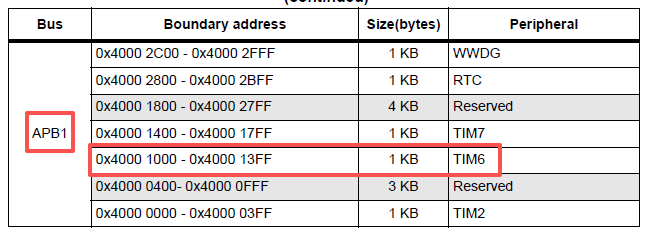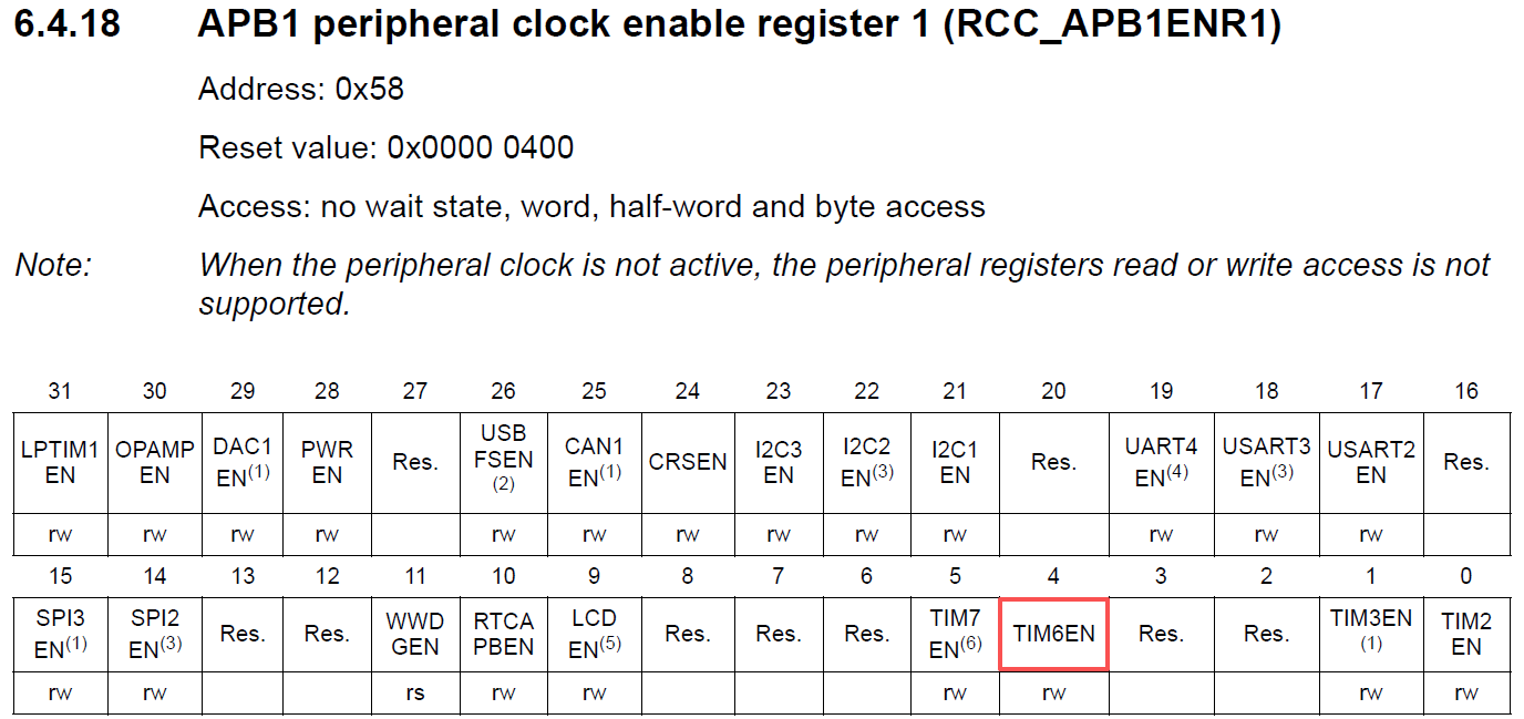 查阅芯片手册,TIM6的时钟由 APB1-PCLK1提供,所以将寄存器RCC_APB1ENR1.TIM6EN 置位即可使能TIM6的时钟: