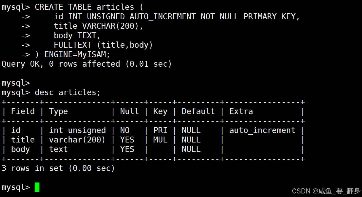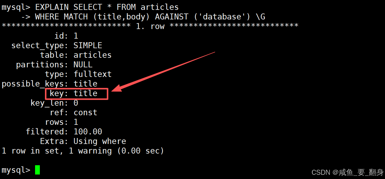 同时使用title和body建立全文索引时,相当于建立了一个复合索引,默认会选择fulltext中的第一个列名作为这个复合索引的索引名,所以这里explain中key对应的索引名为title。