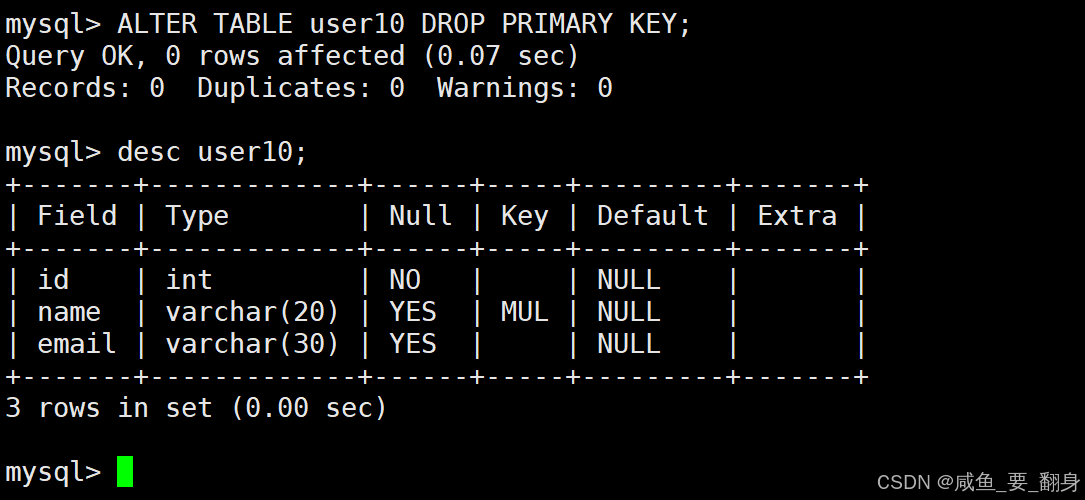 ALTER TABLE user10 DROP PRIMARY KEY;