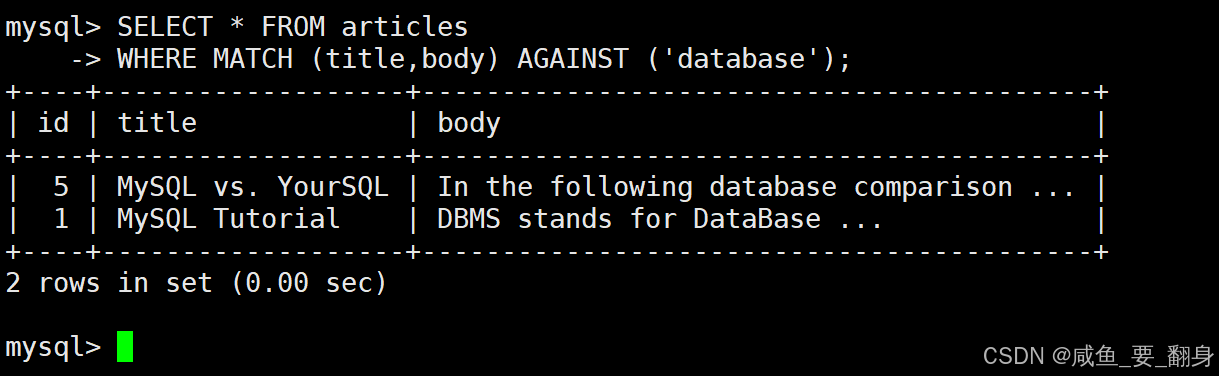 下面恰好则验证了与LIKE的对比表中提到的MATCH AGAINST 'database'使用全文索引快速定位的特性:
