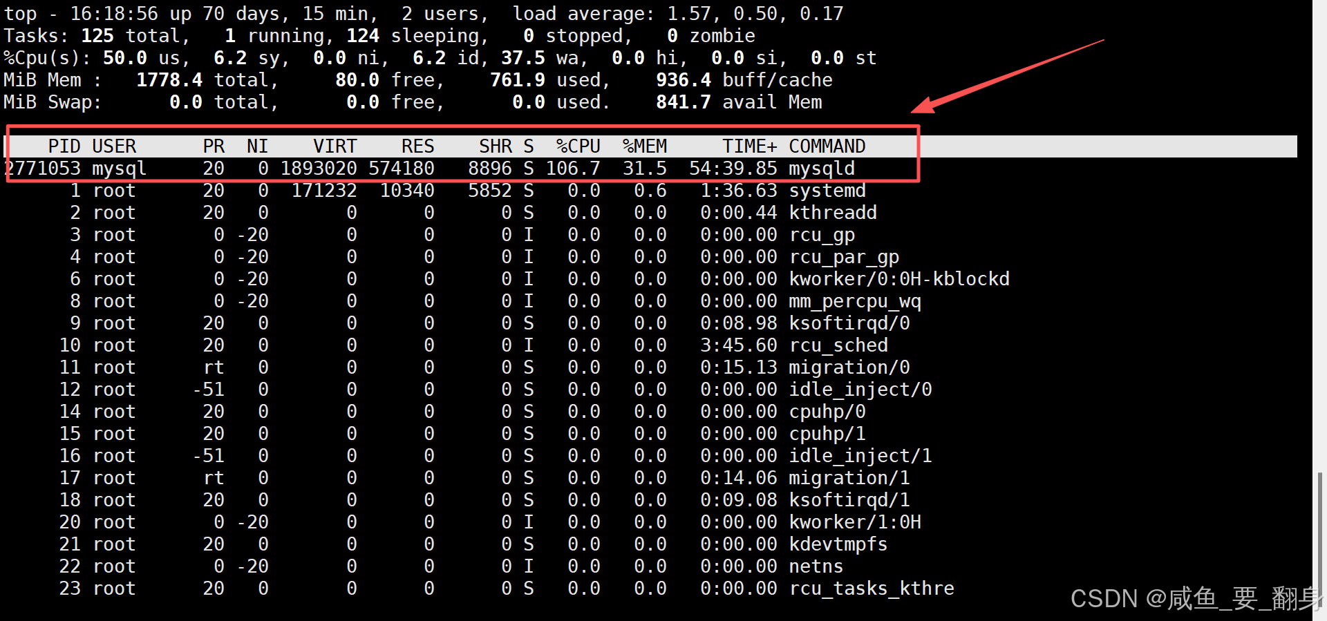 然后我们使用top命令查看当前MySQL服务端的执行过程信息,如下:可以看到MySQL服务端对应的CPU利用率超高!!!这一刻我真的担心我的云服务器撑不住!!!