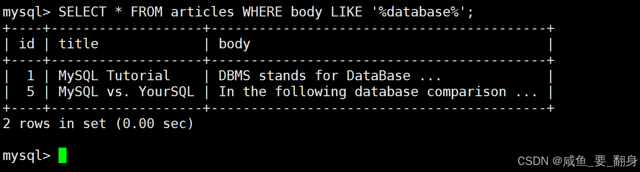 如果要查询哪些文章中包含database关键字,我们可以通过模糊匹配进行查找。**注意,LIKE 匹配默认不区分大小写。**如下: