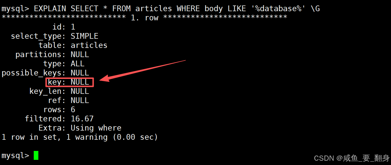 但实际这种查找方式并没有用到全文索引,在SQL语句前面加上explain,可以看到key对应的值为NULL,表示这条SQL在执行过程中没有用到任何索引。如下: