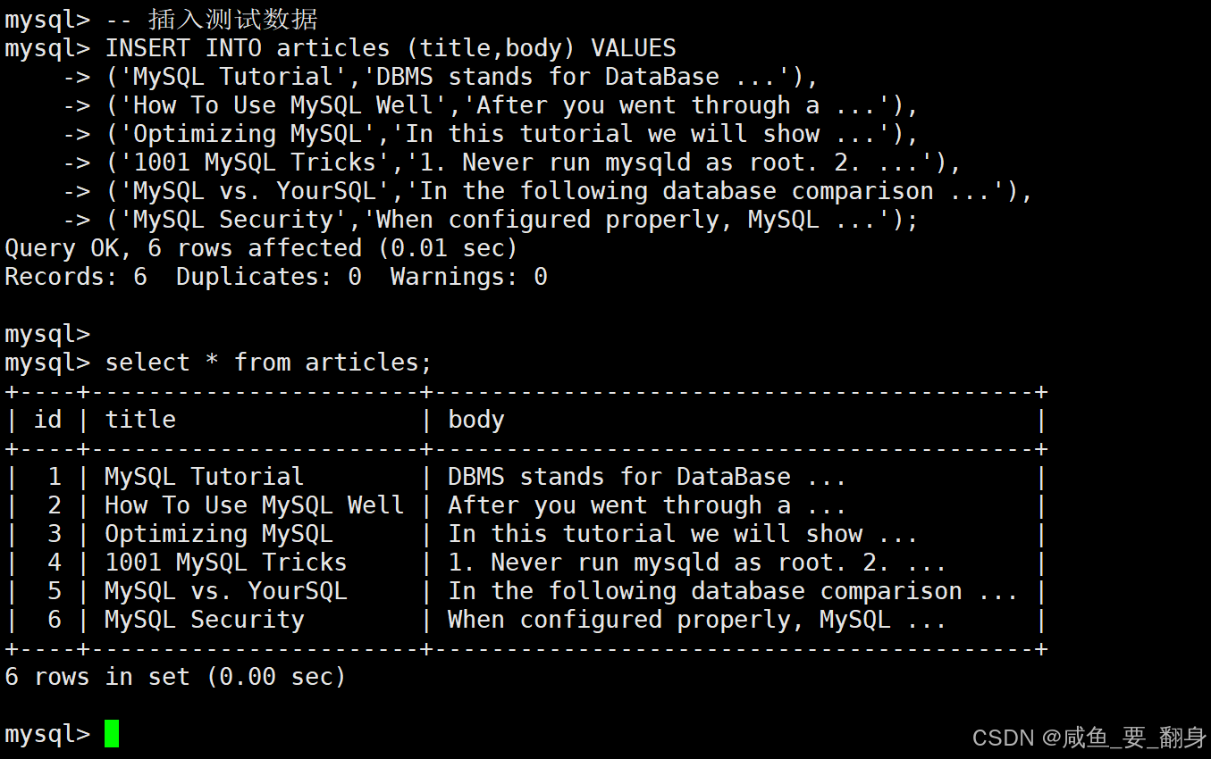 由于是title和body共同建立的全文索引,所以如果文章当中没有出现关键字,但文章名称中出现了关键字则也会被筛选出来(当前示例没有体现出来)。