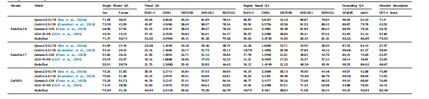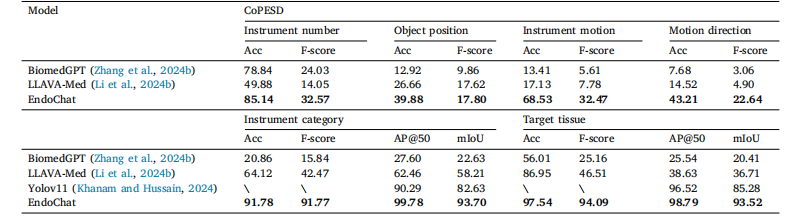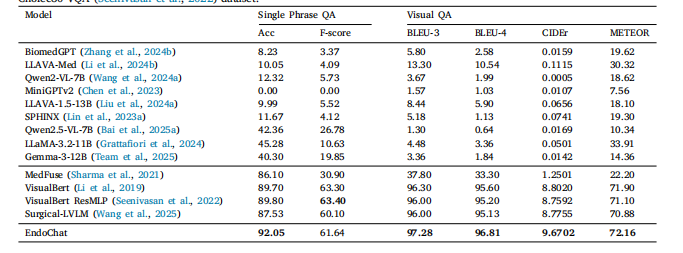 Table 5Comparison experiments with zero-shot MLLMs (top) and specialized models (middle) in Single Phrase QA and Visual QA onCholec80-VQA (Seenivasan et al., 2022) dataset.