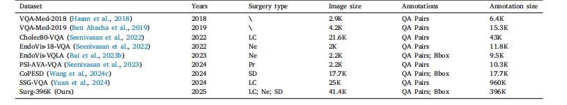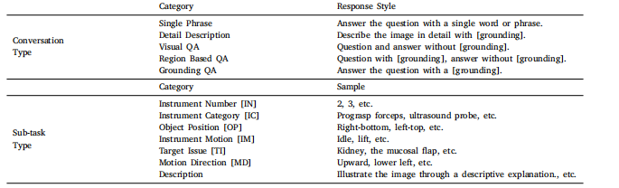 3.1. Surgical multimodal instruction dataset: Surg-396KThe AI-assisted surgery field has experienced a notable expansion inthe availability of public multimodal datasets, particularly VQA pairs,as evidenced by works ranging from Seenivasan et al. (2022) to Yuanet al. (2024). However, the availability of multimodal instruction dataremains limited, primarily due to the time-intensive and less standardized processes involved in human crowd-sourcing. To promote thedevelopment of MLLMs tailored for surgical understanding, we proposeSurg-396K, a surgical multimodal instruction dataset incorporating41K images and 396K instruction-following annotations for endoscopicsurgery. Following the data generation process shown in Fig. 2, wedefine five conversational paradigms and seven attribute-related subtasks to capture the majority of natural language dialogues whileensuring comprehensive coverage of surgical scene understanding. Thestyle of these conversation types and sub-tasks is shown in Table 1.
