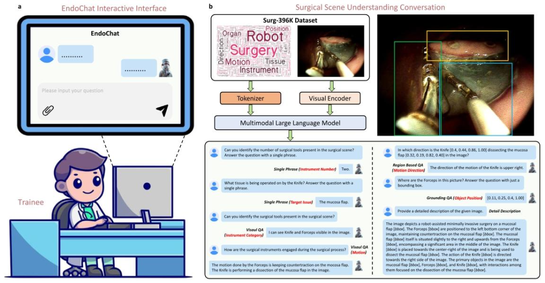 Fig. 1. Overview of the EndoChat. a EndoChat is an interactive multimodal large language model designed for surgical education and training. Users can interactwith EndoChat by uploading images and formulating questions, enabling a comprehensive surgical scene understanding. b EndoChat is trained on Surg-396K, alarge-scale multimodal instruction dataset. Surg-396K includes five conversation paradigms, enabling EndoChat to effectively perform natural language and visualgrounding conversations with trainees. On the bottom is an example of the multi-turn conversation.