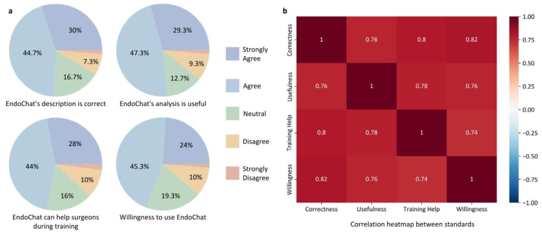 Fig. 4. Endoscopist evaluation of EndoChat in 150 cases. a Questionnaire-based evaluation of EndoChat conducted by endoscopists. The pie charts illustratethe distribution of cases in which endoscopists express varying levels of agreement. b Correlation analysis of four evaluation standards.