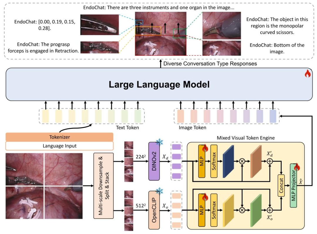 Fig. 3. The overview of the proposed EndoChat. For each input image, we use a multi-scale downsampling strategy to generate different scales and sub-images.2242 and 5122 indicate concatenated features with the shapes 5 × 224×224 × 3 and 5 × 512×512 × 3, respectively. These features are subsequently encodedusing a mixed visual backbone, followed by the Mixed Visual Token Engine. The resulting vision tokens are then transformed into language space, suitable forinput to the Large Language Model. In addition to visual inputs, region coordinates can be auxiliary inputs, along with specific prompts to guide user-definedtasks. This enables the LLM to generate language responses for related object regions.