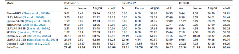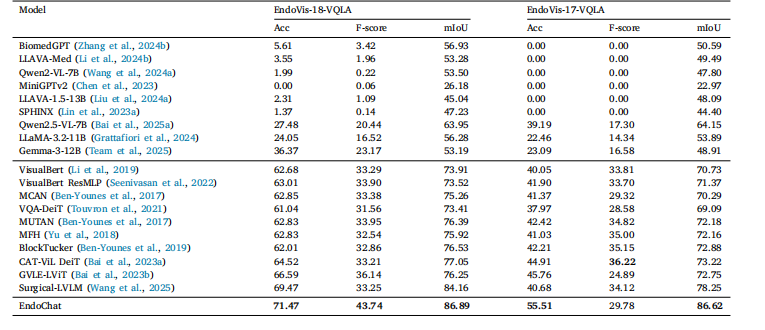 4.1 实现细节 我们与多个多模态大型语言模型(MLLM)开展对比实验,包括BiomedGPT(Zhang 等,2024b)、LLAVA-Med(Li 等,2024b)、Qwen2.5-VL-7B(Bai 等,2025a)、LLaMA-3.2-11B(Grattafiori 等,2024)、Gemma-3-12B(Team 等,2025)、Qwen2-VL-7B(Wang 等,2024a)、GLM-4V-9B(GLM 等,2024)、MiniGPTv2(Chen 等,2023)、LLAVA-1.5-13B(Liu 等,2024a)以及SPHINX(Lin 等,2023a)。这些基准模型涵盖了当前开源领域内与我们的EndoChat参数规模相当的通用型最优模型。此外,我们还将所提方法与一系列专用模型进行基准测试对比,即VisualBert(Li 等,2019)、VisualBert ResMLP(Seenivasan 等,2022)、MCAN(Ben-Younes 等,2017)、VQA-DeiT(Touvron 等,2021)、MUTAN(Ben-Younes 等,2017)、MFH(Yu 等,2018)、BlockTucker(Ben-Younes 等,2019)、CAT-ViL DeiT(Bai 等,2023a)、GVLE-LViT(Bai 等,2023b)以及Surgical-LVLM(Wang 等,2025)。结果中的所有评估指标均以百分比形式呈现,CIDEr指标除外。 在训练大型语言模型(LLM)与混合视觉令牌引擎(Mixed Visual Token Engine)时,我们采用1024×1024的输入分辨率。训练在Surg-396K数据集上进行,仅训练一个轮次(epoch),使用4块NVIDIA A800 GPU。优化器采用AdamW(Loshchilov 和 Hutter,2019),初始学习率设为2e-5,学习率调度策略采用余弦衰减(cosine decay),并包含线性预热阶段(linear warm-up)。训练过程中批次大小(batch size)设为16,训练时长约20小时。 我们开展了四类多模态大型语言模型对比实验:零样本对比(表3-表7)、微调对比(表8)、泛化能力对比(表9)以及消融实验(表10)。除多模态大型语言模型对比外,在表4和表5中,我们还引入了专用模型(如VisualBERT、MCAN),这些模型在测试前均在对比数据集的训练集上完成训练。在泛化能力对比实验中,所有多模态大型语言模型均先在Surg-396K数据集上训练,随后在分布外数据集PSI-AVA-VQA(Seenivasan 等,2023)与EndoVis-17-VQLA-Extend(Bai 等,2025b)上进行评估。 在Surg-396K数据集上进行训练与评估时,其包含的三个子数据集均遵循各自源数据集(Bai 等,2023b;Wang 等,2024c;Seenivasan 等,2022)的数据划分方案。最终,Surg-396K数据集包含34277张训练图像(含339098组问答对)与7097张测试图像(含57494组问答对)。