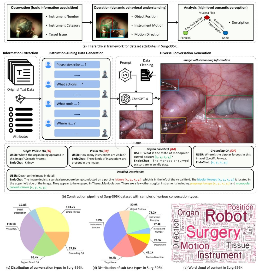 Fig. 2. Overview of the construction pipeline and distribution statistics for our Surg-396K dataset. The pipeline involves five key steps: annotation attributeanalysis, information extraction, instruction-tuning data generation, diverse conversation generation, and data validation.