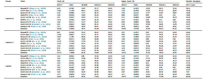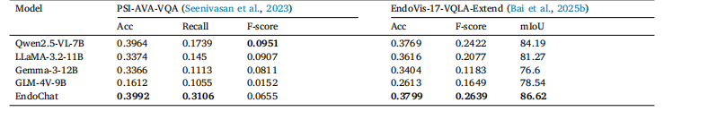 Table 4 Comparison experiments with zero-shot MLLMs (top) and specialized models (middle) in Single Phrase QA and Grounding QA on EndoVis-VQLA(Bai et al., 2023b) dataset