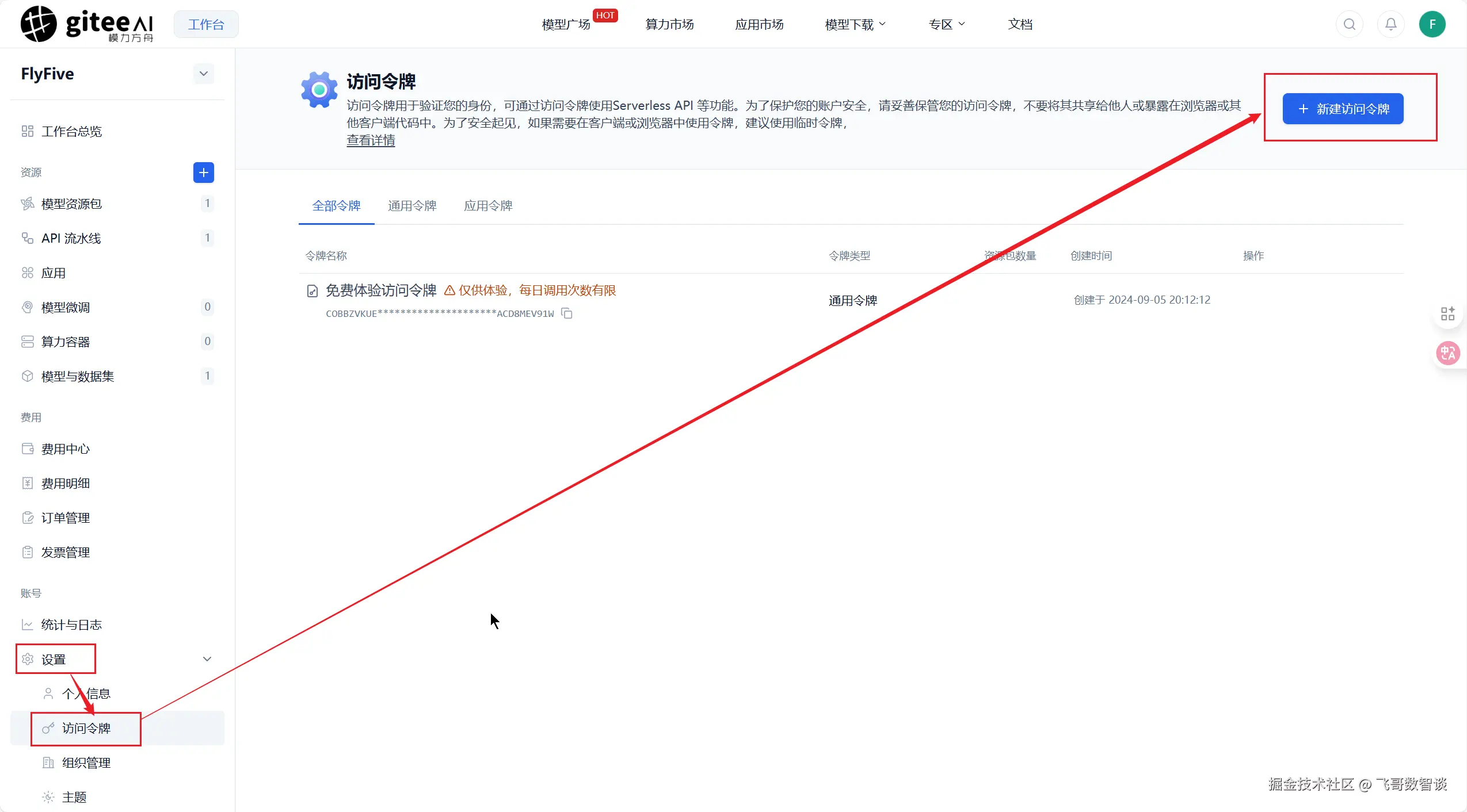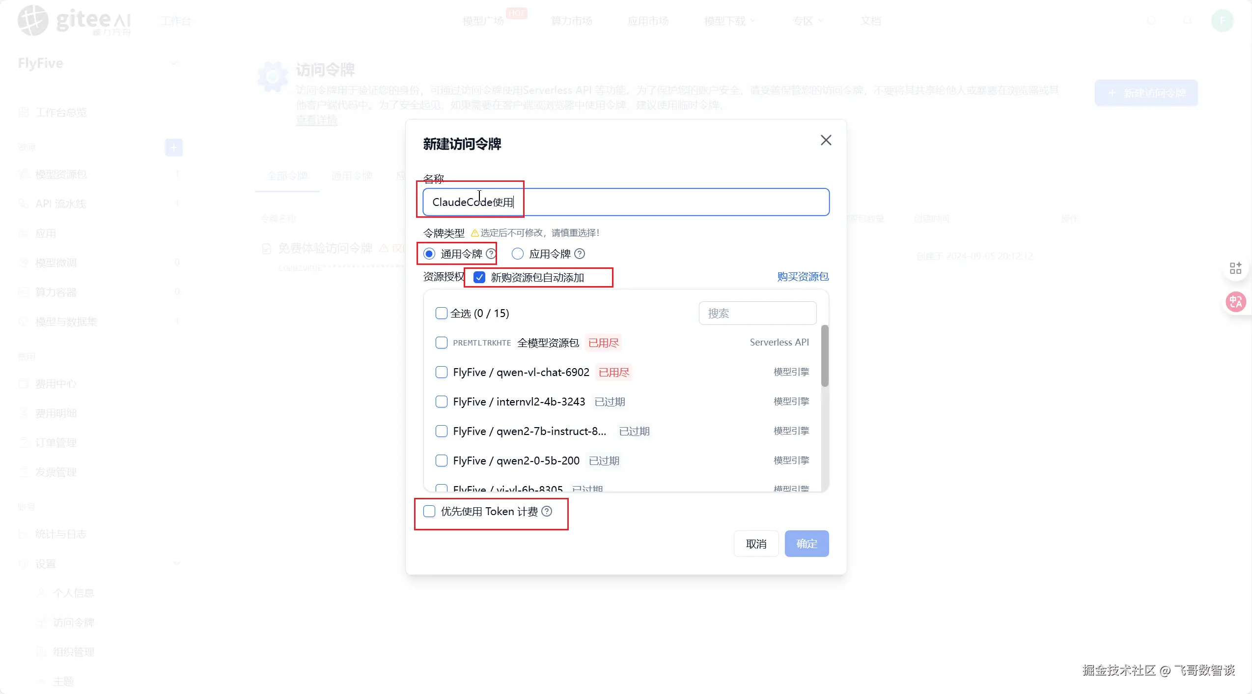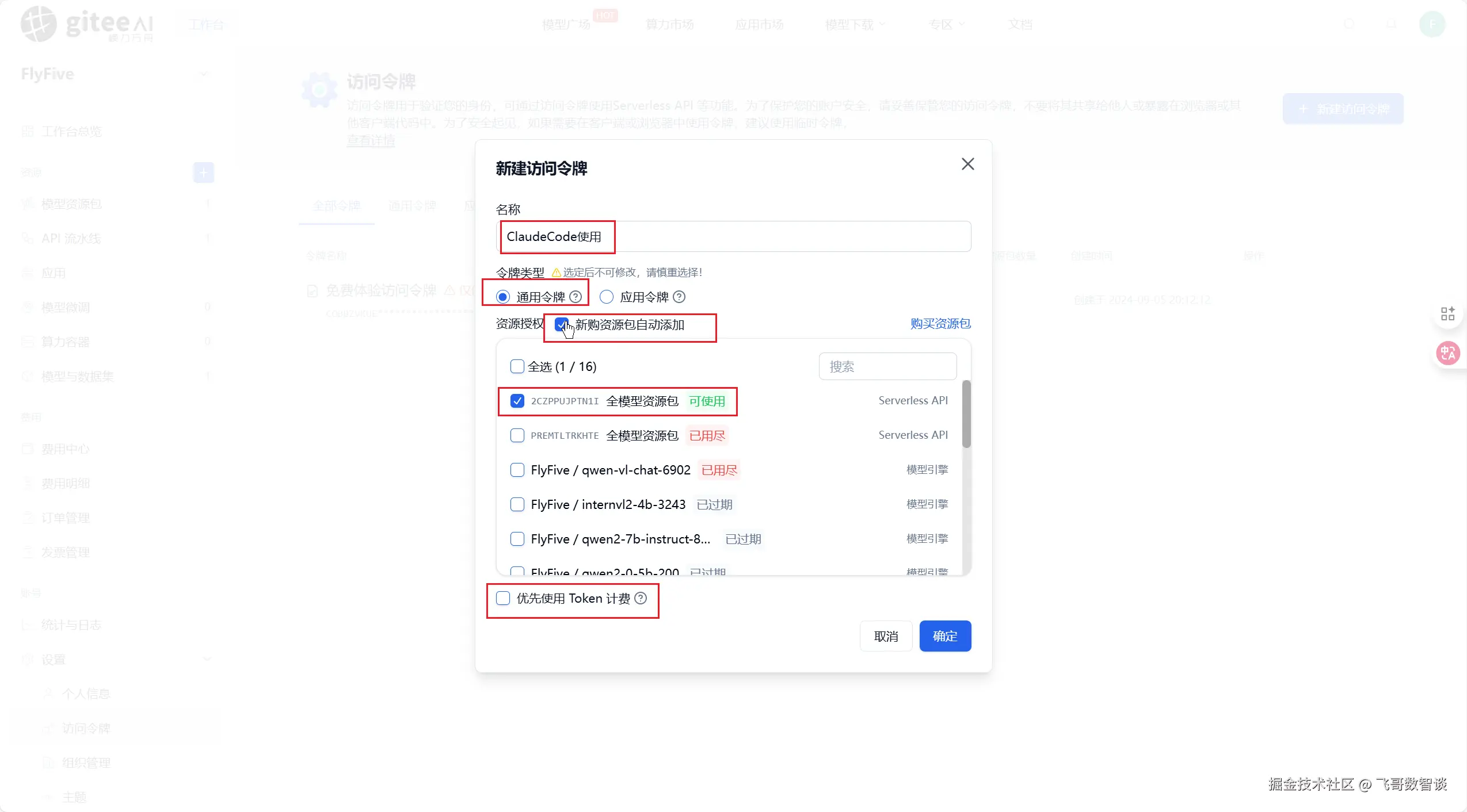 然后回到刚才的新建访问令牌界面,选择刚才购买的模型资源包。
