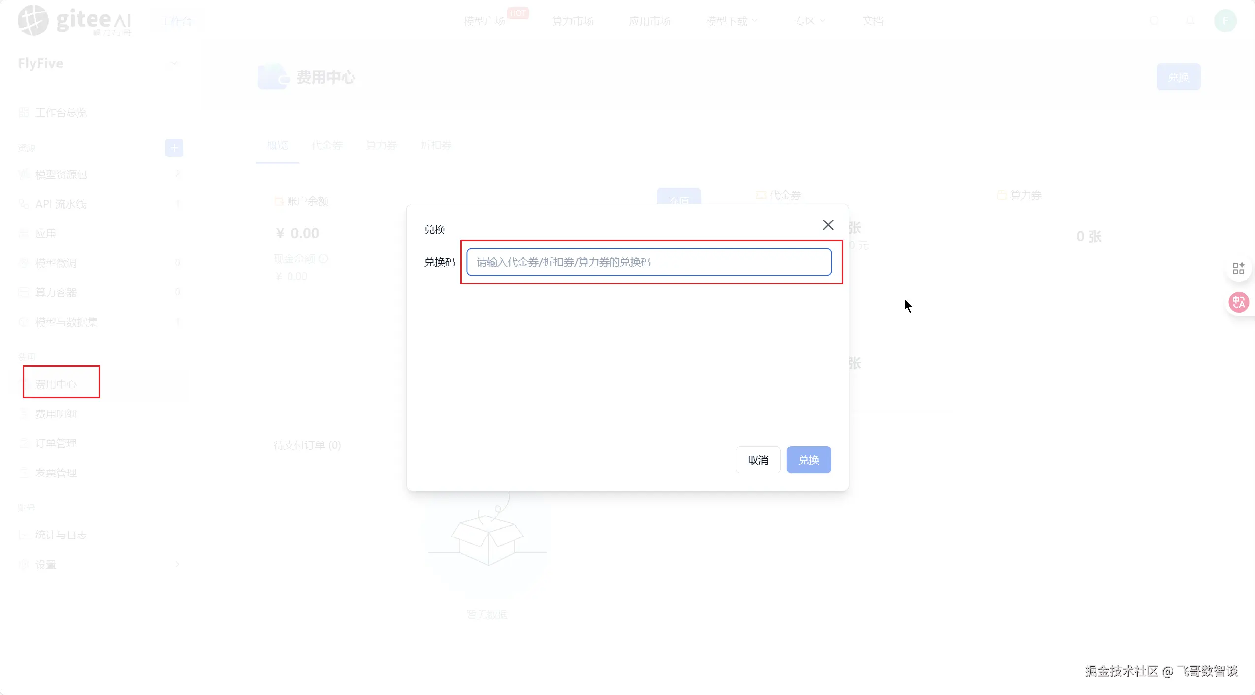 拿到码后去模力方舟"工作台"-"费用中心"-"兑换"即可获得 100元代金券。